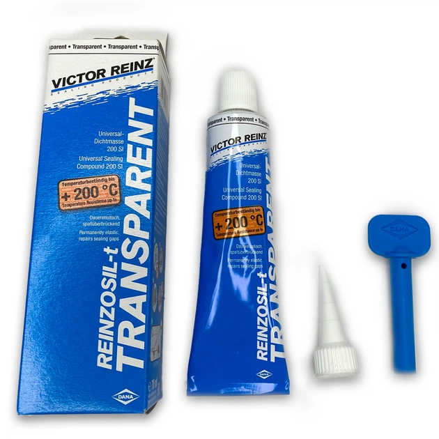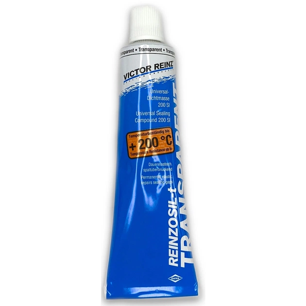 Прозорий силіконовий герметик VICTOR REINZ Reinzosil Tube без вмісту розчинників, що твердне за кімнатної температури та вологості повітря, для герметизації, склеювання й нанесення покриттів. Після застигання REINZOSIL-t практично не має запаху.