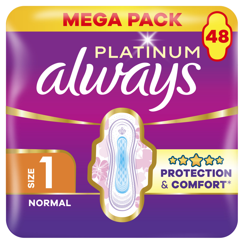 Гігієнічні прокладки Always Platinum забезпечують найкраще поєднання комфорту та захисту серед прокладок Always. Always Platinum більш комфортні (в порівнянні з Always Ultra) завдяки тисячам мікроподушечок і новим, м'яким як шовк крильцям. Вони також забезпечують кращий захист (в порівнянні з Always Ultra) завдяки захисним бічним бар'єрам і ультравсмоктуючий внутрішній шар, який замикає вологу всередині.