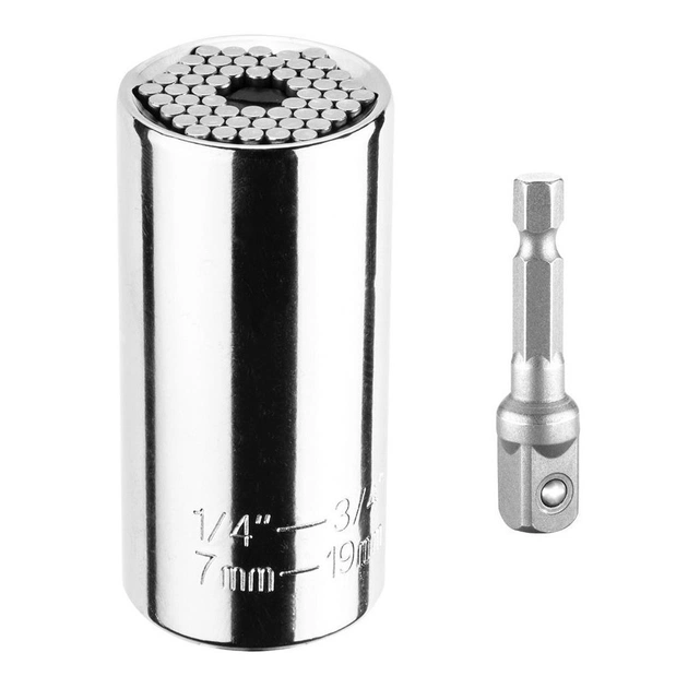 Головка торцева універсальна GRAPHITE, подовжувач, шестигранна головка, діаметр 7-19мм 55H224. Універсальна головка 7-19 мм, 1/4"-3/4", 55Х224 GRAPHITE – виріб, що дозволяє легко відкручувати проточені гайки або болти неправильної форми. Включає торцевий ключ з діапазоном розмірів 7-19 мм (шостигранного типу) і подовжувач для кріплення ключа до викрутки або дриля. Використання невеликих стрижнів усередині інструменту – він адаптується до більшості головок гвинтів і болтів. Для роботи з болтами діаметром від 7 до 19 мм