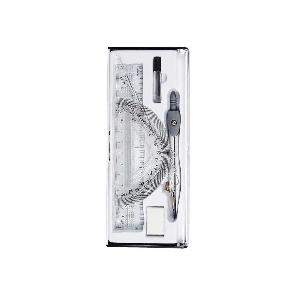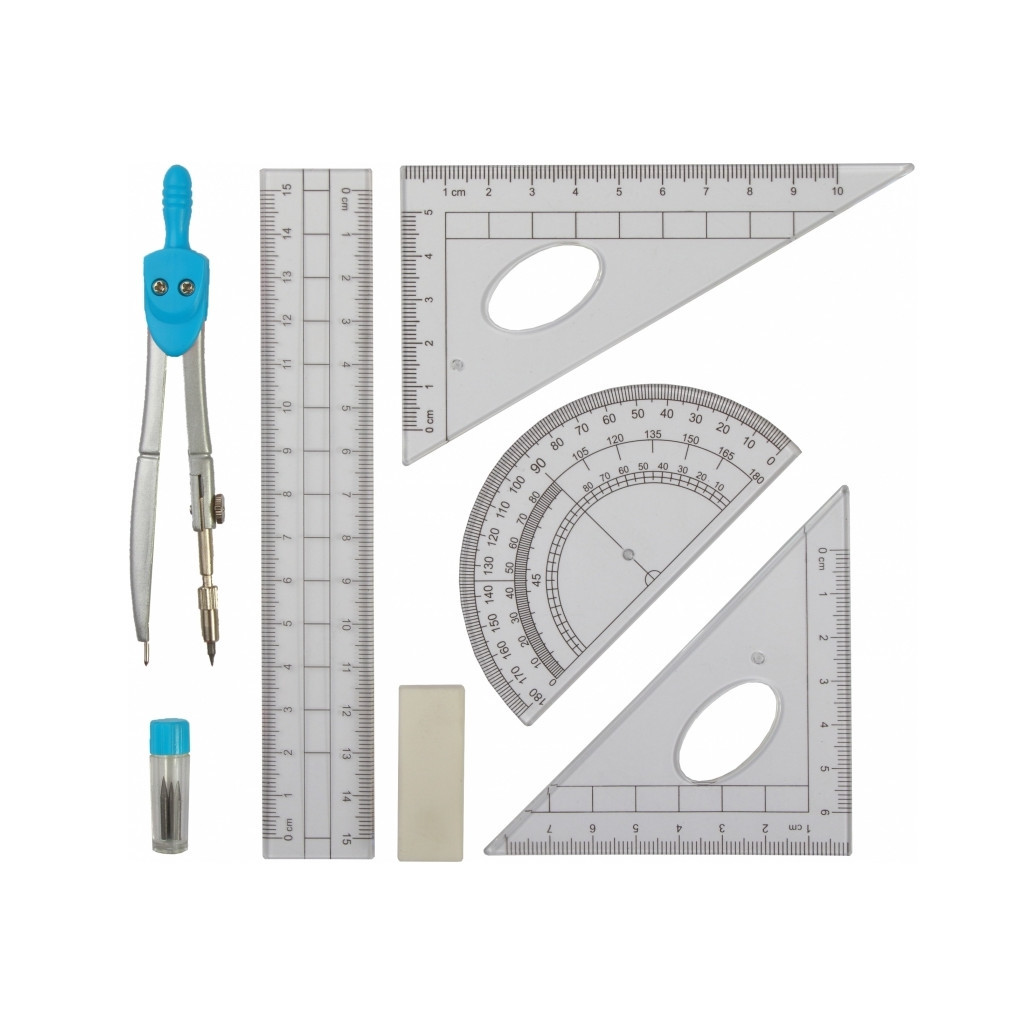Готовальня Economix із 8 предметів — металевий циркуль із запасними грифелями, лінійка 15 см, 2 кутники 10 см, транспортир, гумка. Постачається в пластиковій коробці з підвісом.