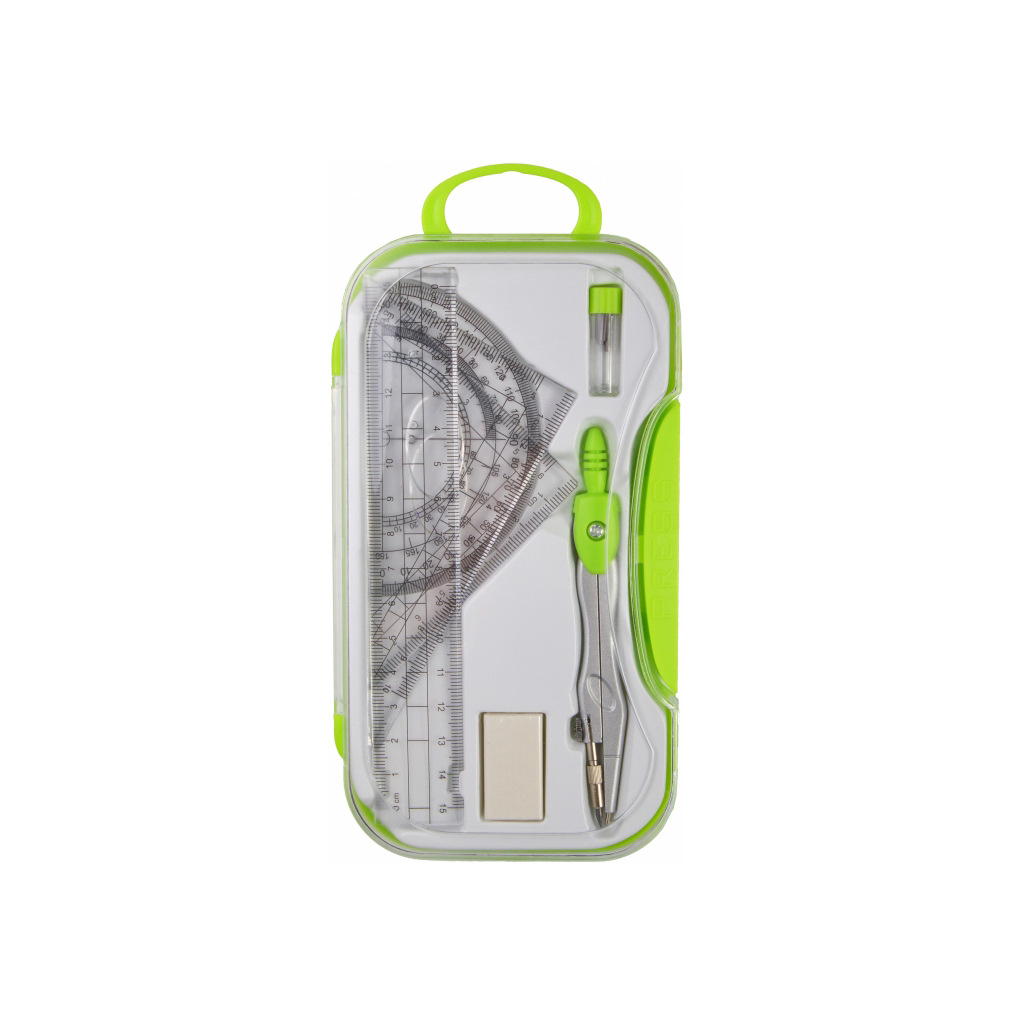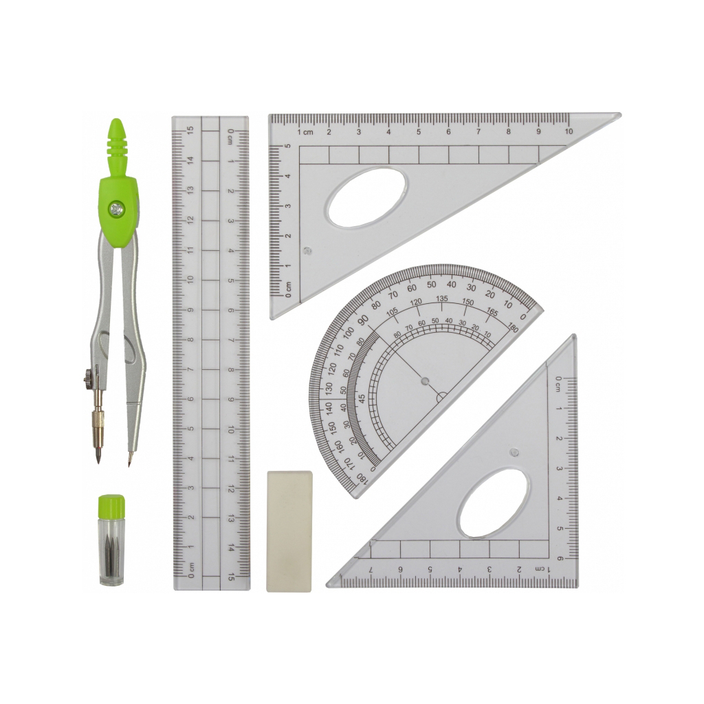Готовальня Economix на 7 предметів. До набору входить: Металевий циркуль із запасними грифелями, лінійка 15 см, 2 кутники 10 см, транспортир, гумка.