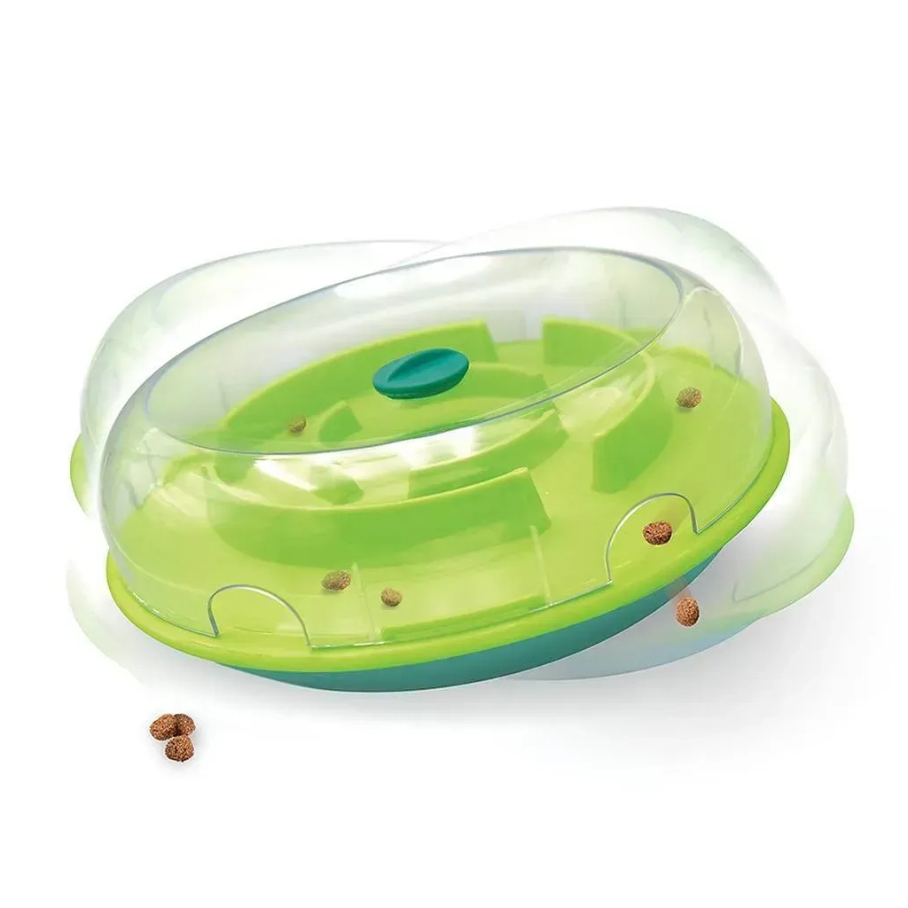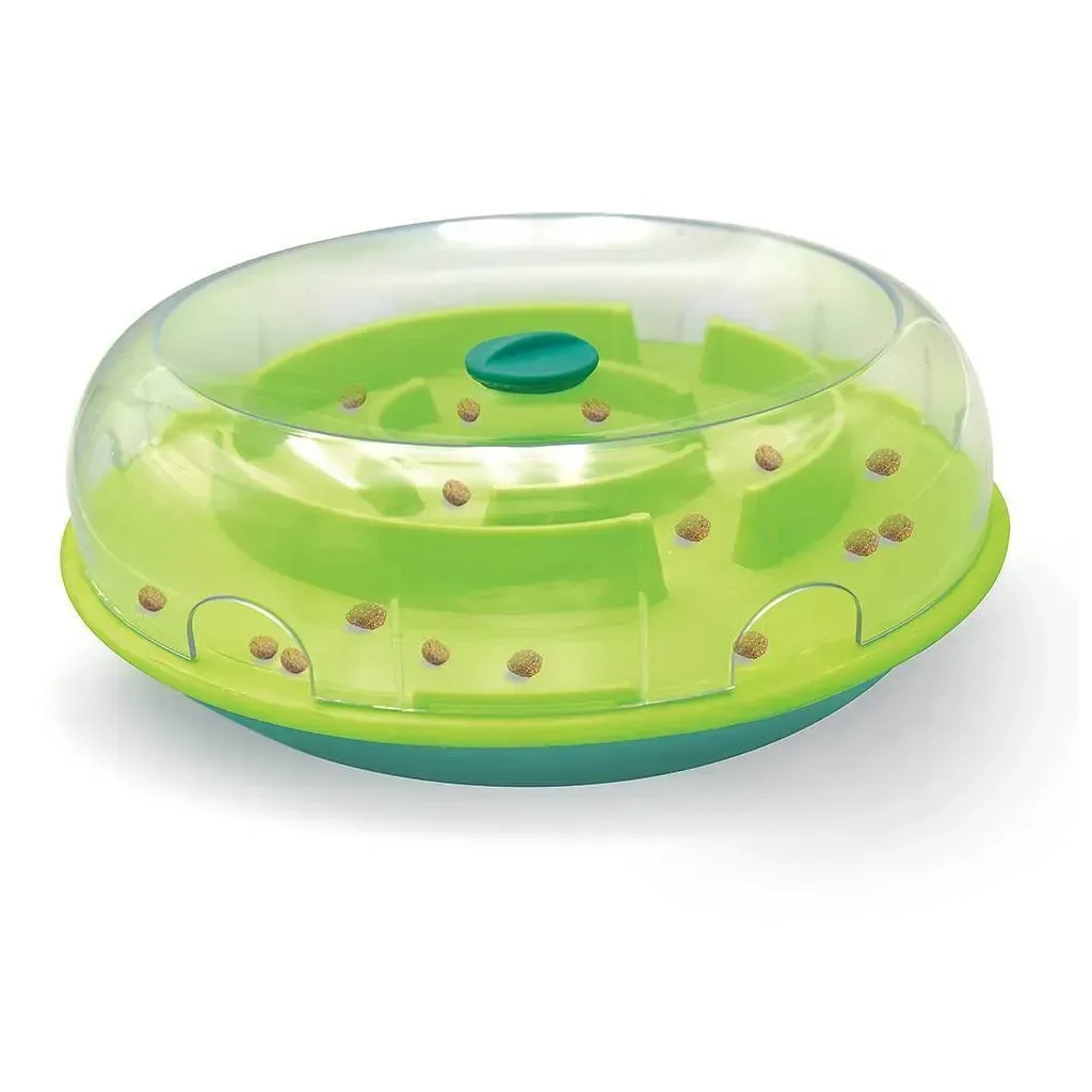 ЯК ГРАТИ: вийміть обмежувач з кришки. Засипте миску їжею або ласощами. Щоб полегшити гру для новачків, злегка струсіть миску, щоб корм розприділився по всій мисці. За допомогою обмежувача заблокуйте кришку. Помістіть миску на підлогу, покажіть вихованцеві як гойдати миску носом або лапами, доки гранули корму не почнуть висипатися крізь бокові отвори. Прозора кришка та корм, який проглядається крізь неї мотивуватимуть собаку грати до останнього шматочка. Ця миска ідеальна для всіх типів корму: вологого та сухого.