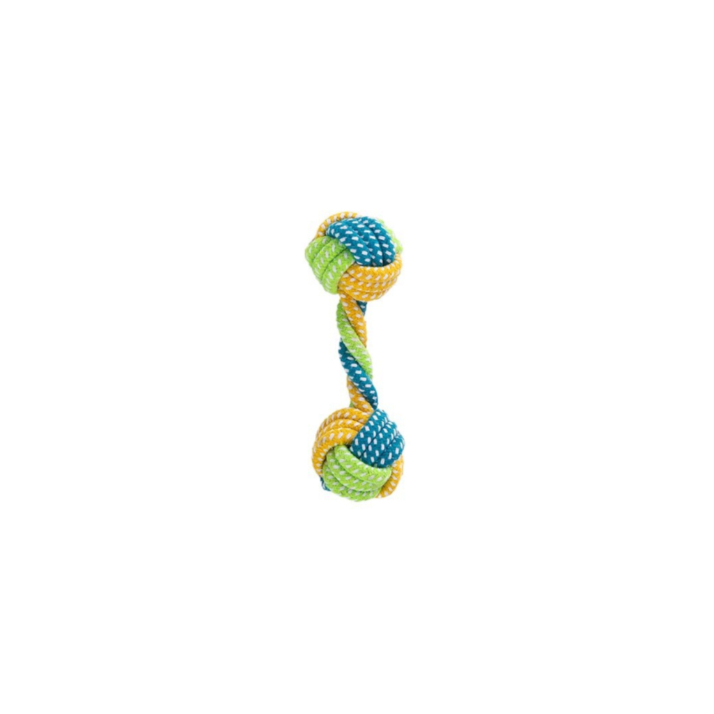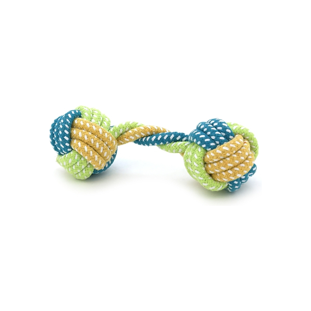 Іграшка для собак мотузка-апорт із вузлами - це функціональне ігрове рішення для активних вихованців, виконане у формі гантелі. Виріб виготовлений із міцних бавовняних ниток із посиленими вузлами, що забезпечують довговічність при інтенсивній експлуатації. Розмір 6×18 см оптимальний для собак дрібних та середніх порід, а контрастне зелено-синє забарвлення забезпечує хорошу видимість під час ігор на природі.