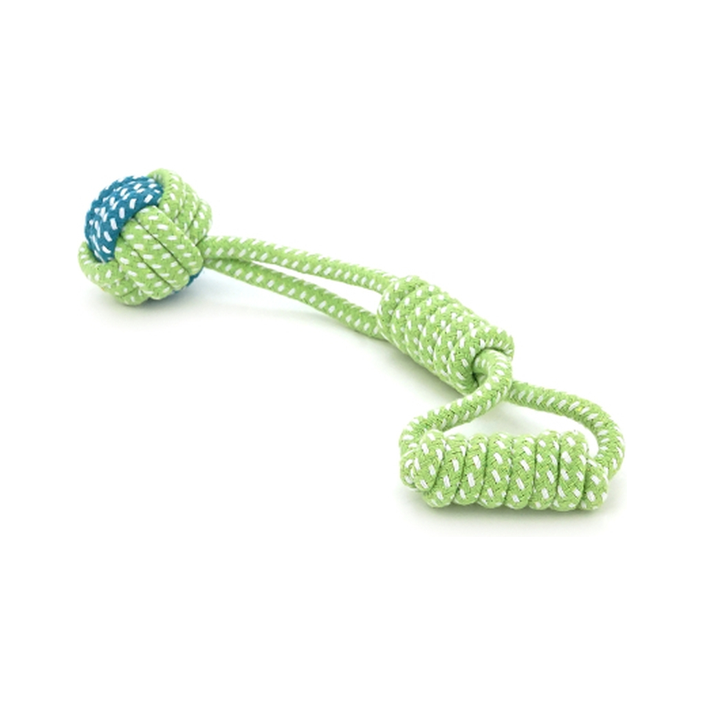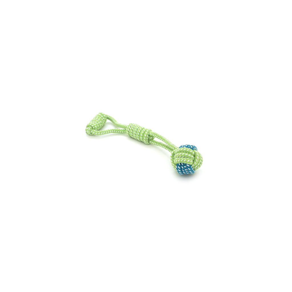 Іграшка для собак мотузка-апорт з вузлами - це багатофункціональне рішення для активних ігор та гігієни ротової порожнини вашого вихованця. Іграшка форми кулі діаметром 6 см із зручною ручкою-петлею довжиною 27 см виготовлена з переплетених бавовняних волокон із надійними вузлами. Контрастне зелено-синє забарвлення забезпечує хорошу видимість на різних поверхнях під час гри.