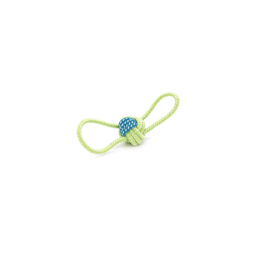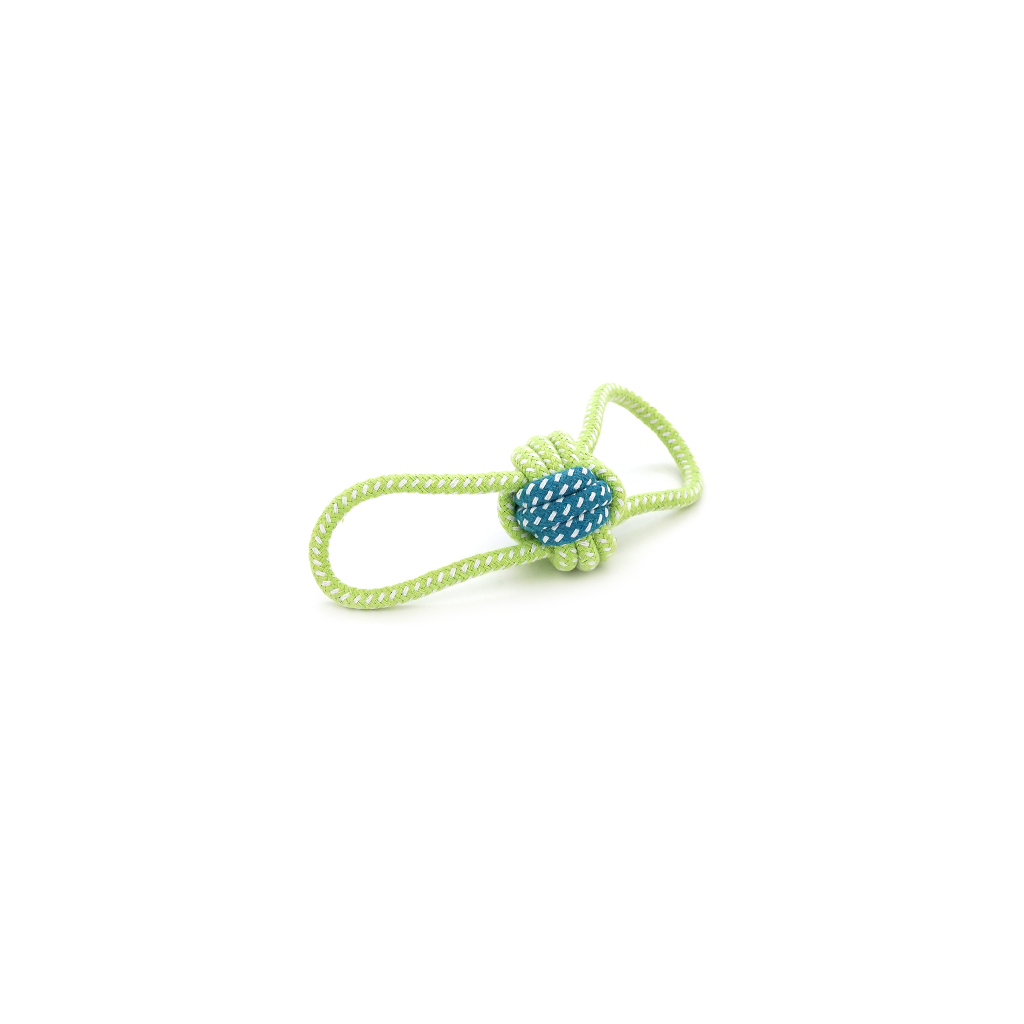 Іграшка для собак мотузка-апорт - це функціональний виріб для активних ігор та тренувань домашніх тварин. Іграшка виконана у формі кулі діаметром 6 см із двома міцними петлями-ручками загальною довжиною 16 см, виготовлена з переплетених бавовняних волокон із вузловими з`єднаннями. Контрастне зелено-синє забарвлення забезпечує хорошу видимість іграшки на різних поверхнях під час гри.