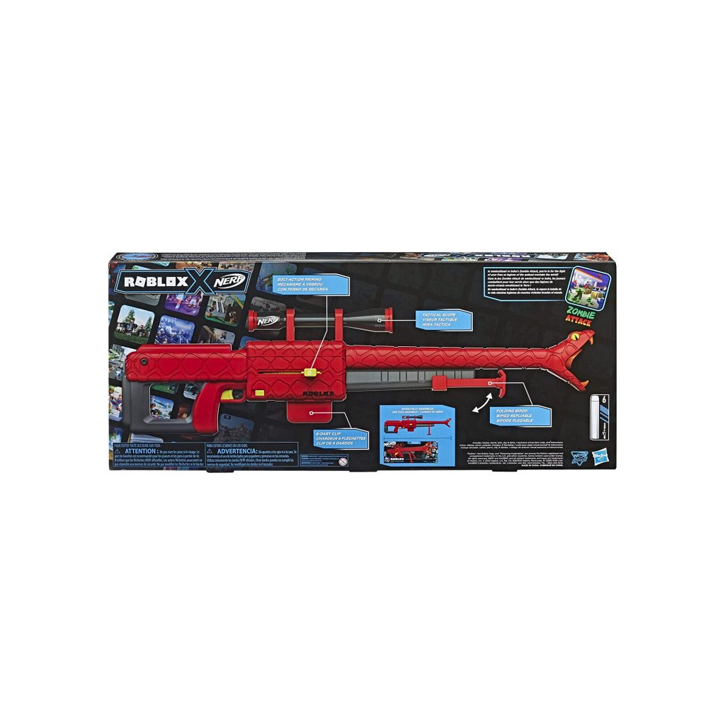 Цей бластер, що стріляє дротиками, натхненний грою Roblox Zombie Attack від Wenlocktoad vs Indra! Nerf включає спеціальний код, який дозволяє вам викупити ексклюзивний віртуальний предмет в Roblox!