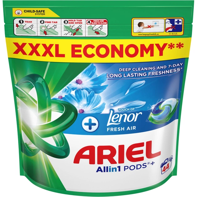 Ariel, рекомендований компаніями Whirlpool, Electrolux, Candy та Beko, представляє капсули з рідким засобом для прання Ariel All-in-1 Pods+ Touch of Lenor Дотик свіжого повітря. Завдяки додатковій блакитній камері вони забезпечують глибоке очищення та довготривалу свіжість до 7 днів (при зберіганні). Вони створені для бездоганної роботи навіть при циклах за низької температури, швидко розчиняються навіть у холодній воді та забезпечують бездоганні результати. Для досягнення найкращого результату спочатку покладіть капсули у задню частину пустого барабана, а зверху покладіть одяг.