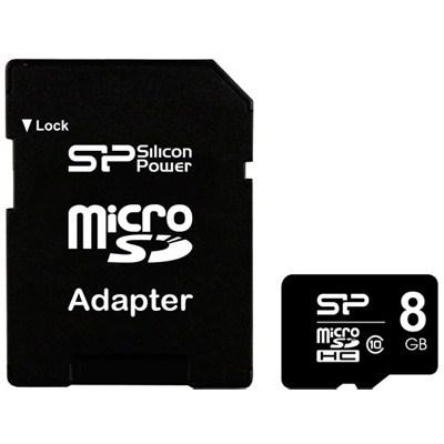 Miсro-SDHC memory card 8Gb Silicon Power (с SD адаптером) class 10 (SP008GBSTH010V10-SP) - карта пам'яті формату microSDHC, яка відноситься до швидкісного Class 10 і відрізняється високою швидкістю запису даних 10 Мбіт/с. Завдяки цьому, карта пам'яті підходить для використання з сучасними смартфонами, інтернет-планшетами, електронними книгами, а також фотоапаратами і відеокамерами, при використанні адаптера на SD-формат.