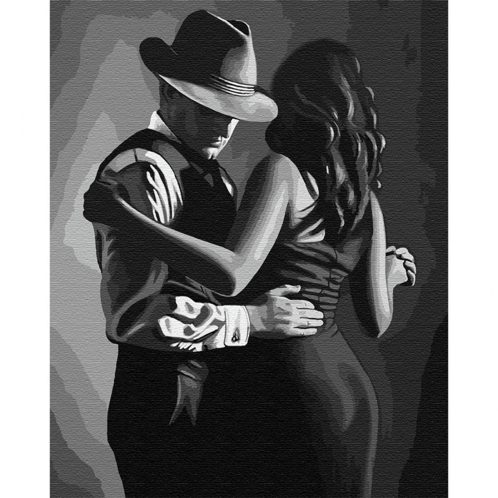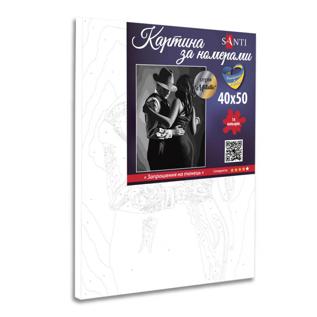 Картина за номерами SANTI Запрошення на танець з металізованими фарбами. Красива пара в обіймах один одного з ефектом срібла та платини.