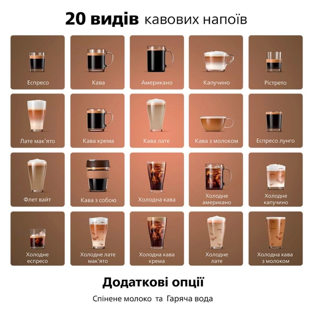 20 рецептів включають напої, які зігрівають душу, такі як еспресо, лате та капучино, а також освіжаючу каву з льодом. Була вдосконалена систему заварювання так, щоб навіть кава з льодом мала такий же вишуканий смак, як і гарячі напої.