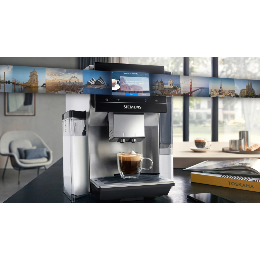 Дизайн SIEMENS EQ700 TQ715R03 в кольорі нержавіючої сталі елегантний і функціональний. Сопла подачі кави регулюються по висоті від 7,5 см до 14 см, підходячи для різних чашок. Догляд за машиною максимально спрощений: система autoMilk Clean підтримує гігієну молочної системи за допомогою повністю автоматичного парового очищення після кожного напою. Комбінована програма calc'nClean об'єднує видалення накипу і очищення. Заварювальний блок легко знімається для промивання водою, а піддон для крапель і контейнер для кавової гущі можна мити в посудомийній машині. Машина сама нагадає про необхідність очищення, видалення накипу або заміни фільтра для води Brita Intenza (фільтр і тест-смужка для визначення жорсткості води входять в комплектацію). Додаткові зручності включають автовимкнення, блокування від дітей, індикацію готовності до роботи і можливість управління через телефон за допомогою мобільного додатку (смарт-функції). Компактні габарити (38 x 35,2 x 46,7 см), вага 10,7 кг і шнур живлення довжиною 100 см дозволяють зручно розмістити цю окремо стоячу кавоварку на вашій кухні.
