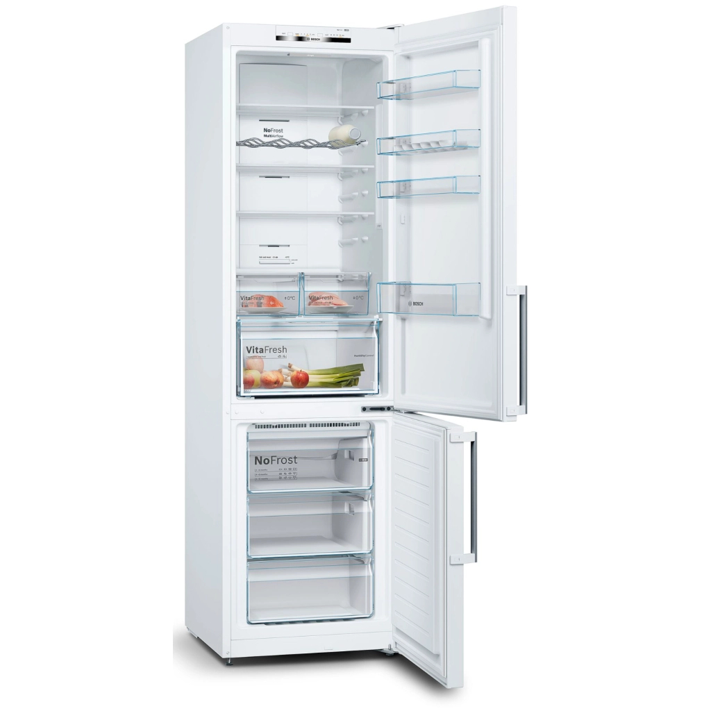 Холодильник Bosch KGN39VW316 - це ідеальне рішення для тих, хто цінує комфорт, надійність та інноваційність у побутовій техніці. Завдяки своєму витонченому дизайну в класичному білому кольорі та компактним розмірам (висота - 203 см, ширина - 60 см, глибина - 66 см), цей окремостоячий апарат з легкістю впишеться у будь-який інтер'єр кухні, забезпечивши при цьому максимальну ефективність використання простору.