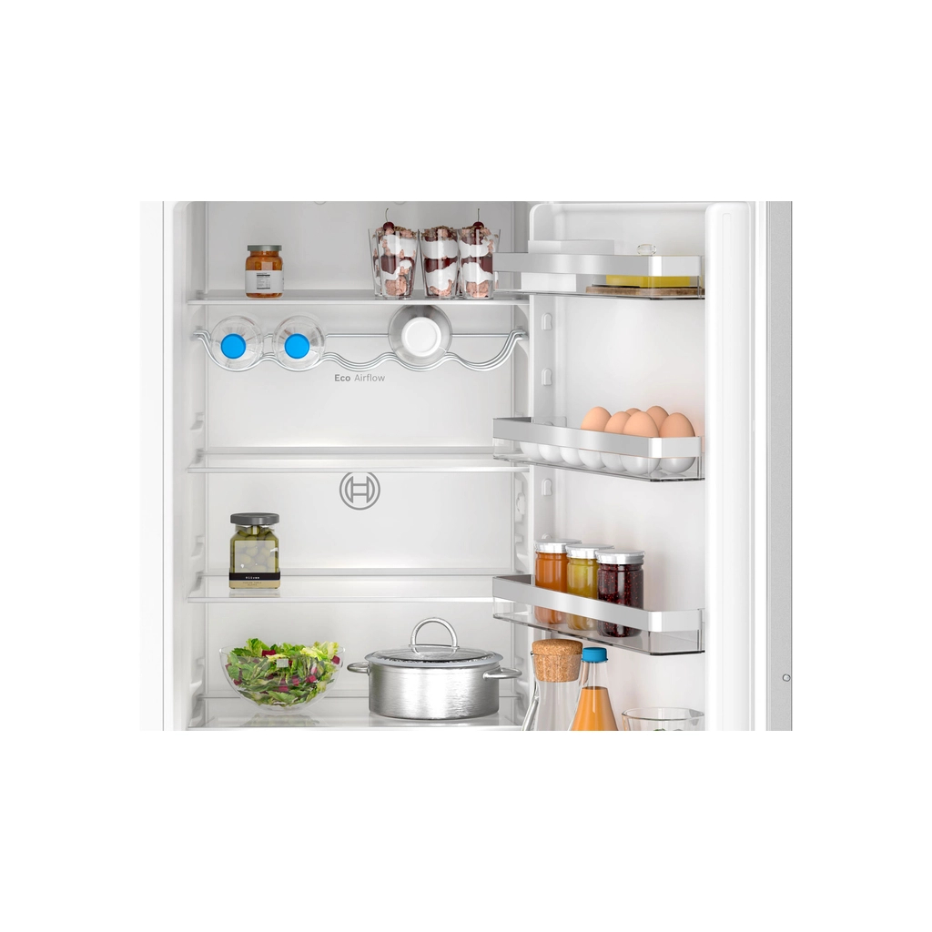 Вбудований холодильник Bosch Serie 4 KIN96VFD0 поєднує в собі місткість, енергоефективність та інноваційні технології, створюючи ідеальні умови для довготривалого зберігання продуктів. Загальний об’єм 290 л забезпечує достатньо простору для сімейного користування, а компактний формат дозволяє гармонійно інтегрувати прилад у будь-яку кухню. Завдяки низькому рівню шуму всього 34 дБ холодильник працює майже безшумно, створюючи комфорт навіть у відкритих житлових просторах.