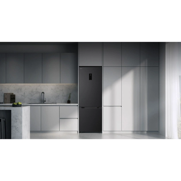 Холодильник LG GC-B509ETKM з нижньою морозильною камерою має загальний корисний об'єм 375 л (262 л холодильне відділення + 113 л морозильне). Пристрій оснащений інверторним компресором, системою Total No Frost, технологією DoorCooling+ та зовнішнім LED-дисплеєм. Зони Fresh Balancer і Fresh Converter дозволяють точно регулювати вологість і температуру для різних продуктів. Річне споживання енергії становить 263 кВт·год (клас E), рівень шуму - 35 дБ. Гарантія - 1 рік повна + 10 років на компресор.