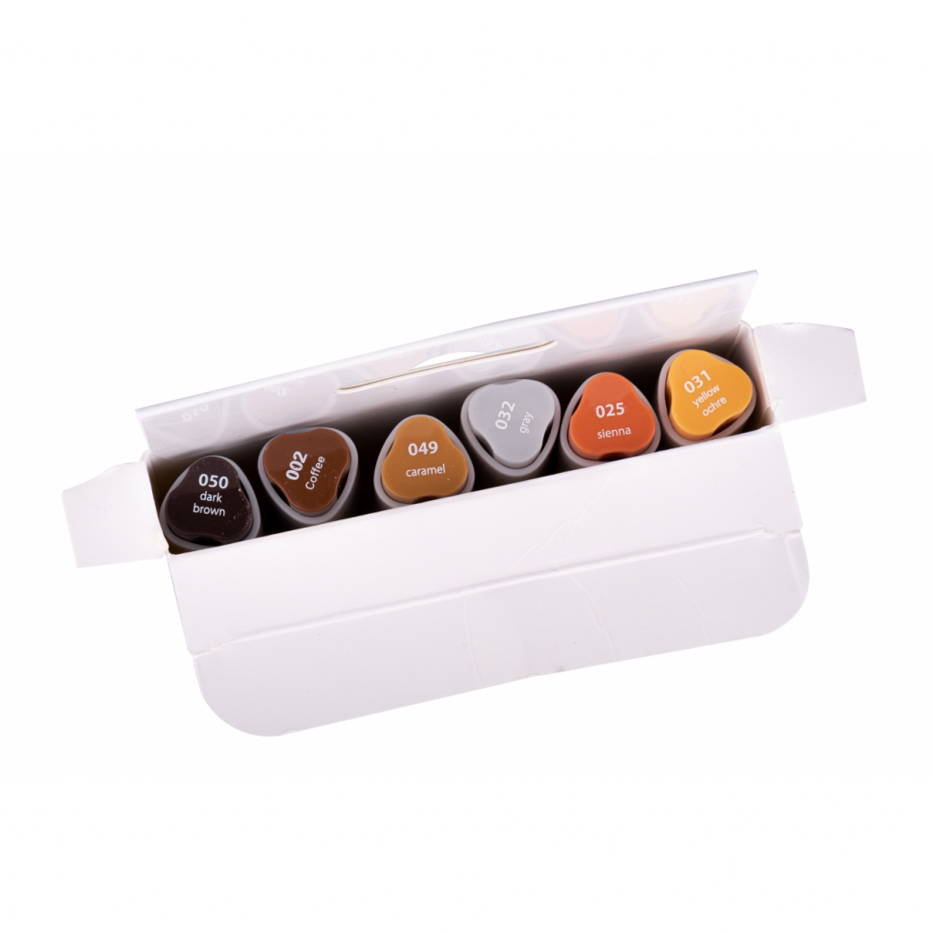 Водорозчинні, світлостійкі чорнила призначені для живопису і малювання в змішаних техніках. Поєднують в собі властивості маркерів і акварельних фарб. Для досягнення акварельного ефекту можна розмити деталі малюнка за допомогою змоченого водою пензля на папері або розбавити водою чорнило на палітрі. Оснащені двома видами наконечників: м'який пензель для точної деталізації малюнка і долото - для заповнення великих фрагментів. Для роботи можна використовувати акварельний папір або спеціальний папір для малювання маркерами. Склад набору: 031 охра жовта, 025 Сієна, 032 сірий, 049 карамель, 002 кавовий, 050 темно-коричневий