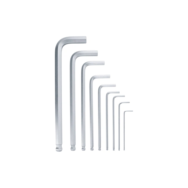 Універсальні багатофункціональні ключі з високоякісними шестигранними головками з кулястою головкою. Міцні та стійкі до іржі завдяки високоякісній сталі S2 і матовому нікелевому покриттю. Зручна довжина шестигранних ключів забезпечує більший крутний момент і більший радіус дії, особливо в обмеженому просторі
