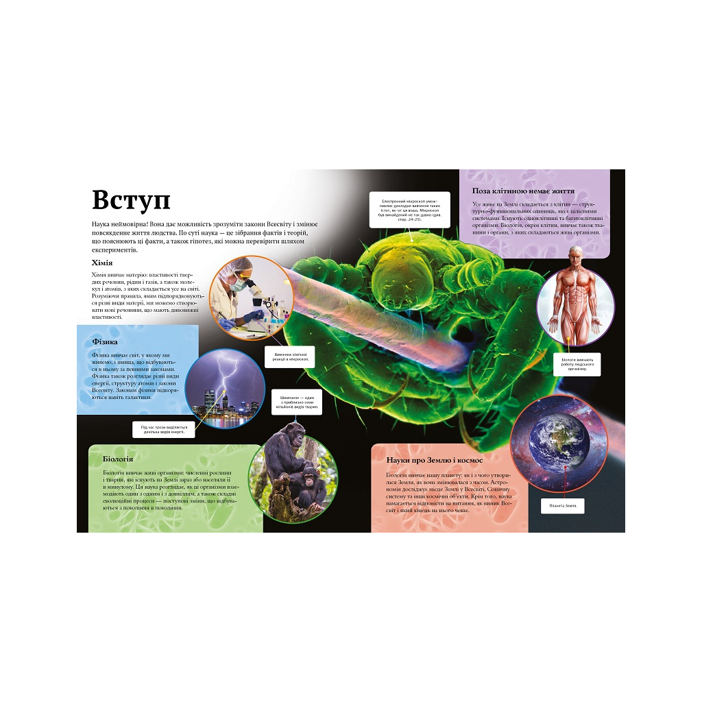 Ця корисна енциклопедія стане у пригоді допитливим дітлахам, адже відкриє найцікавіші таємниці майже всіх галузей науки. Читачі дізнаються, з чого складається атом, коли народився Всесвіт, завдяки чому «працюють» розумні матеріали, як улаштований організм людини та безліч дивовиж, що нас оточують. Із цією книжкою навчання перетвориться на справжнє задоволення, під час якого діти не лише ознайомляться з найважливішими досягненнями науки, а й поступово розвиватимуть увагу, пам’ять і критичне мислення.