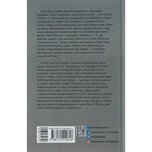 Книжка Полін Браун «Естетичний інтелект» показує, наскільки важлива естетика в нашому житті і, звісно, в бізнесі. Пані Браун переконана: це м’яз, який можна накачати, тобто будь-хто може розвинути естетичне чуття й застосовувати це вміння на практиці. На думку авторки, естетична складова продукту не менш важлива за його функціональність, а компанії мусять приділяти естетиці стільки ж уваги, скільки й фінансовим звітам. Як прокачати «естетичний м’яз», як сформувати естетичну цінність товарів, як правильно розказати про це споживачам — на ці й інші теми авторка веде з читачем невимушену розмову, наводячи безліч прикладів сильних естетичних рішень, втім, залишає досить простору для власних висновків.