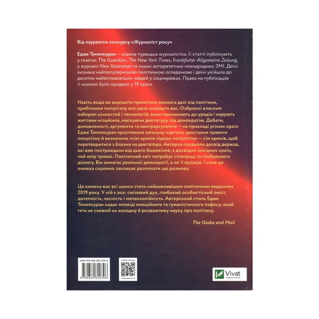 Навіть якщо ви вирішите триматися якомога далі від політики, прибічники популізму все одно знайдуть вас. Озброєні власним набором цінностей і технологій, вони проникають до урядів і керують життями мільйонів, маскуючи диктатуру під демократію. Дебати, домовленості, аргументи та контр аргументи — на прикладі різних країн Едже Темелкуран простежила загальну картину зростання правого популізму і визначила «сім кроків лідера-популіста» — сім кроків, щоб перетворитися з блазня на диктатора. Авторка поєднала досвід держав, які вже постраждали від цього божевілля, з досвідом західних країн, чий опір триває. Політичний світ потребує співпраці та глобального діалогу.