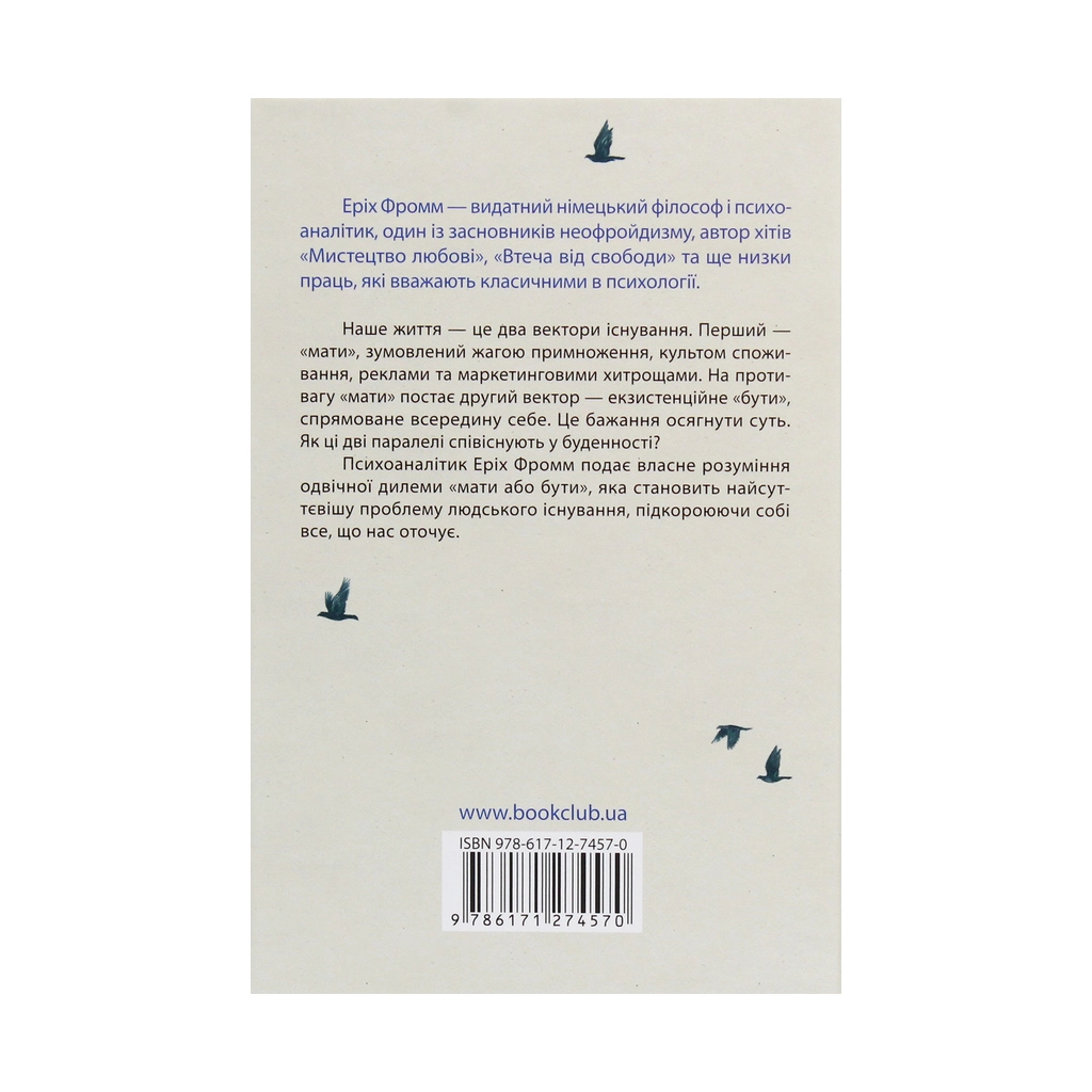 Психоаналітик Еріх Фромм подає власне розуміння одвічної дилеми «мати або бути», яка становить найсуттєвішу проблему людського існування, підкороюючи собі все, що нас оточує.