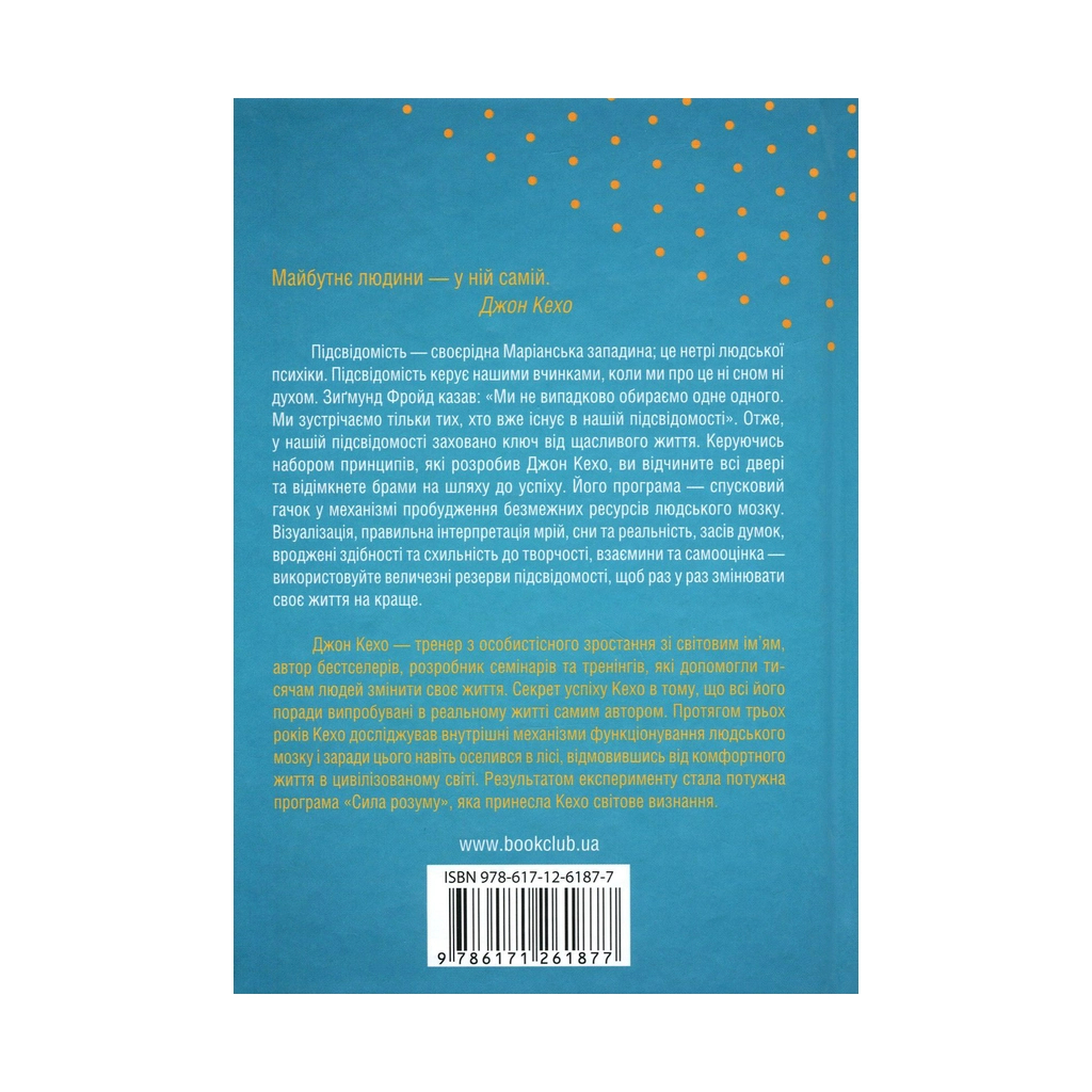 Підсвідомість - своєрідна Маріанська западина; це нетрі людської психіки. Підсвідомість керує нашими вчинками, коли ми цього навіть не усвідомлюємо. Недарма Зиґмунд Фройд казав: "Ми не випадково обираємо одне одного. Ми зустрічаємо тільки тих, хто вже існує в нашій підсвідомості". Так і в нашій підсвідомості заховано ключ від щасливого життя. Керуючись набором принципів, які розробив Джон Кехо, ви відчините всі двері та відімкнете брами на шляху до успіху. Його програма - спусковий гачок у механізмі пробудження безмежних ресурсів людського мозку. Візуалізація, правильна інтерпретація мрій, сни та реальність, засів думок, вроджені здібності та схильність до творчості, взаємини та самооцінка - використовуйте величезні резерви підсвідомості, щоб раз у раз змінювати своє життя на краще.