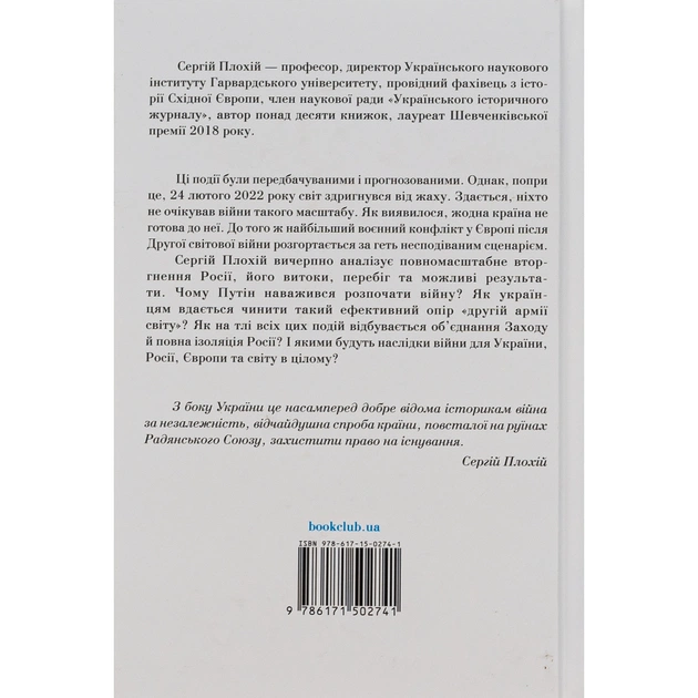 Сергій Плохій, один із провідних істориків України, вичерпно аналізує повномасштабне вторгнення росії, його витоки, перебіг та можливі результати. Чому путін наважився розпочати війну? Як українцям вдається чинити такий шалений опір «другій армії світу»? Як на тлі всіх цих подій відбувається об’єднання Заходу й повна ізоляція росії? І якими будуть наслідки війни для України, росії, Європи та світу в цілому?