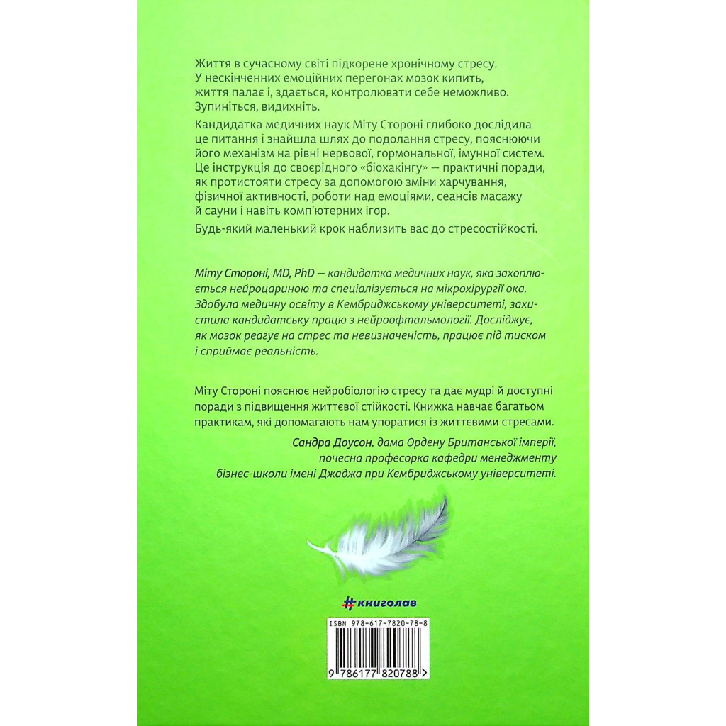 Надмір інформації з різних гаджетів, багатозадачність, дедлайни, існування в умовах пандемії та ізоляції – як впоратись з невгамовним стресом у цьому шаленому світі? Міту Стороні глибоко дослідила це питання і знайшла шлях до подолання стресу, пояснюючи його механізм на рівні нервової, гормональної, імунної системи. І її книжка – своєрідна інструкція як зберігати спокій і покращити своє життя. Це практичні поради, як протистояти стресу за допомогою зміни харчування, фізичної активності, сну, роботи над емоціями, медитації, сеансів масажу і навіть комп’ютерних ігор. Будь-який маленький крок наблизить до стресостійкості.