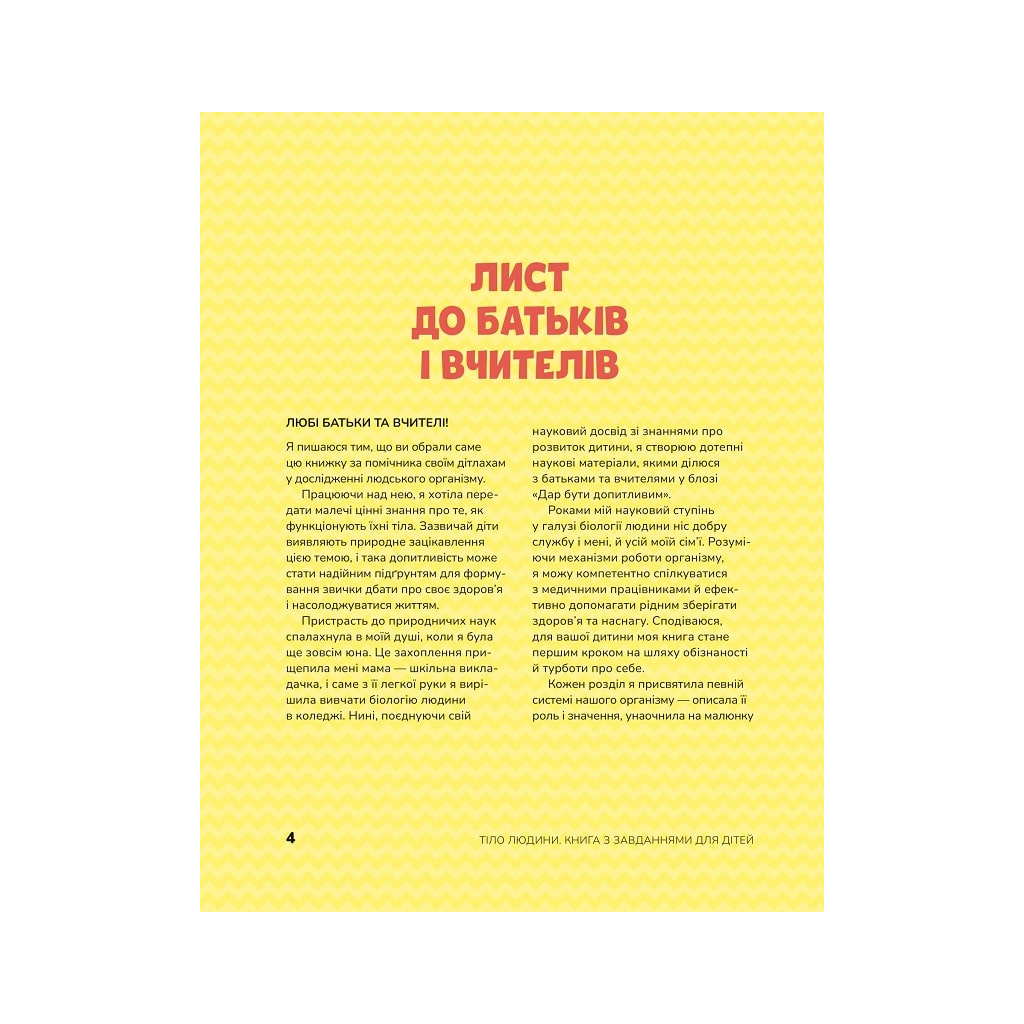 Ця книжка стане чудовим помічником дітлахам у дослідженні людського тіла та надійним порадником для формування звички дбати про своє здоров’я. Кожен розділ присвячено певній системі організму: описано її роль і значення, а також подано низку цікавих фактів. Засвоювати матеріал дітям легше у формі гри, тому до кожного розділу дібрано завдання, що мають зацікавити маленьких дослідників і посприяти процесу навчання. Найважливіші з них можна виконати просто на сторінці книжки олівцями чи фломастерами. Видання призначене для дітей дошкільного й молодшого шкільного віку. І якщо найменші читачі потребуватимуть допомоги дорослих, то школярі зможуть виконати всі завдання самотужки.