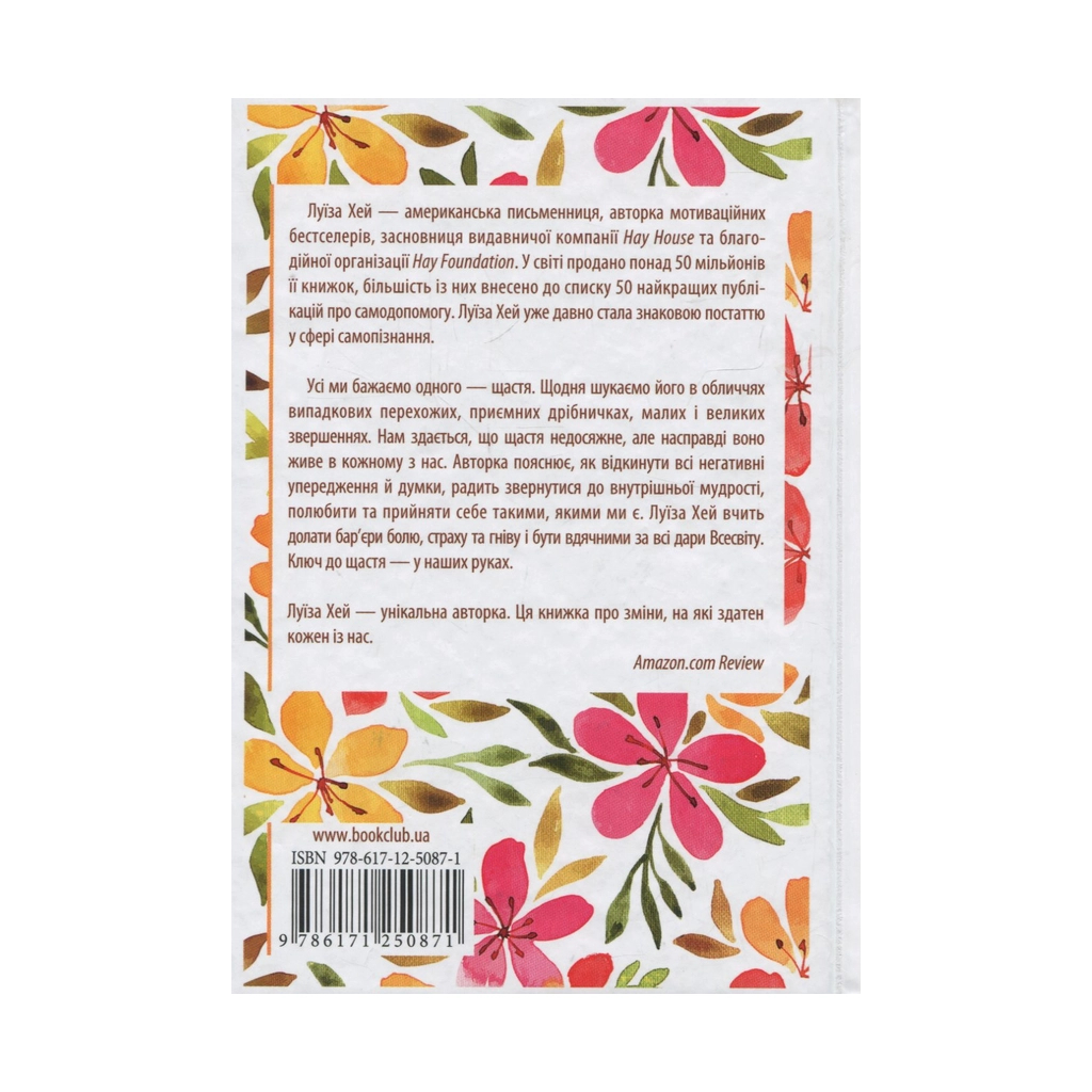 Усі ми бажаємо одного - щастя. Щодня шукаємо його в обличчях випадкових перехожих, приємних дрібничках, малих і великих звершеннях. Нам здається, що щастя недосяжне, воно ходить далеко від нас. Ця книжка розкриє найзаповітнішу таємницю сховку щастя. Адже воно - у кожному з нас. Авторка пояснює, як відкинути всі негативні упередження й думки, що заважають бути щасливими та насолоджуватися життям. Вона радить звернутися до внутрішньої мудрості, полюбити та прийняти себе таким, яким ми є. Луїза Хей вчить долати бар'єри болю, страху та гніву і бути вдячним за всі дари Всесвіту. Ключ до щастя - у наших руках.