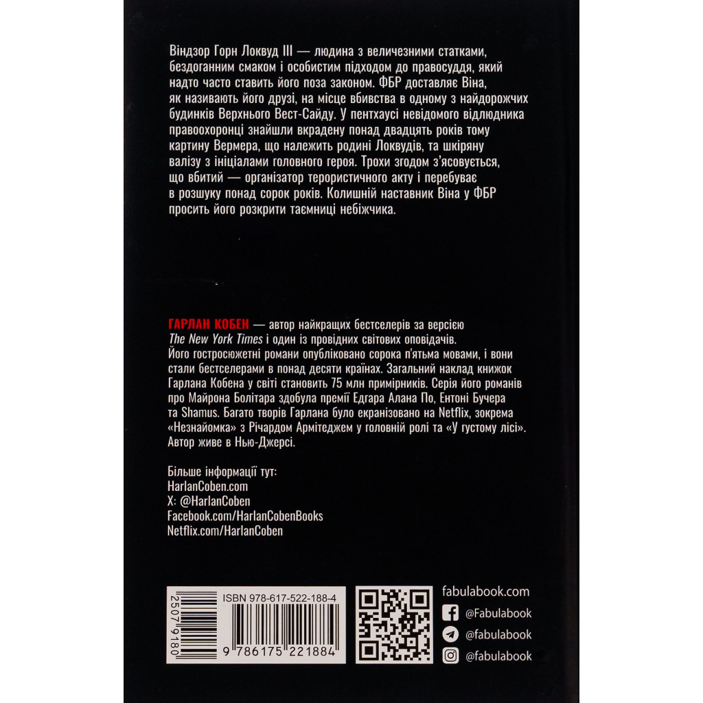 Цей захопливий трилер є новим спінофом популярної серії Гарлана Кобена про Майрона Болітара. Головному герою — багатому й харизматичному Віндзору Горну Локвуду ІІІ доведеться знайти зв’язок між кількома, здавалося б, непов’язаними злочинами: нещодавнім убивством відлюдника в пентхаусі одного з найпрестижніших будинків Верхнього Вест-Сайду, терористичним актом, який стався сорок п’ять років тому, крадіжкою картин Вермера й Пікассо, які належали Локвудам, убивством рідного дядька та викраденням кузини.