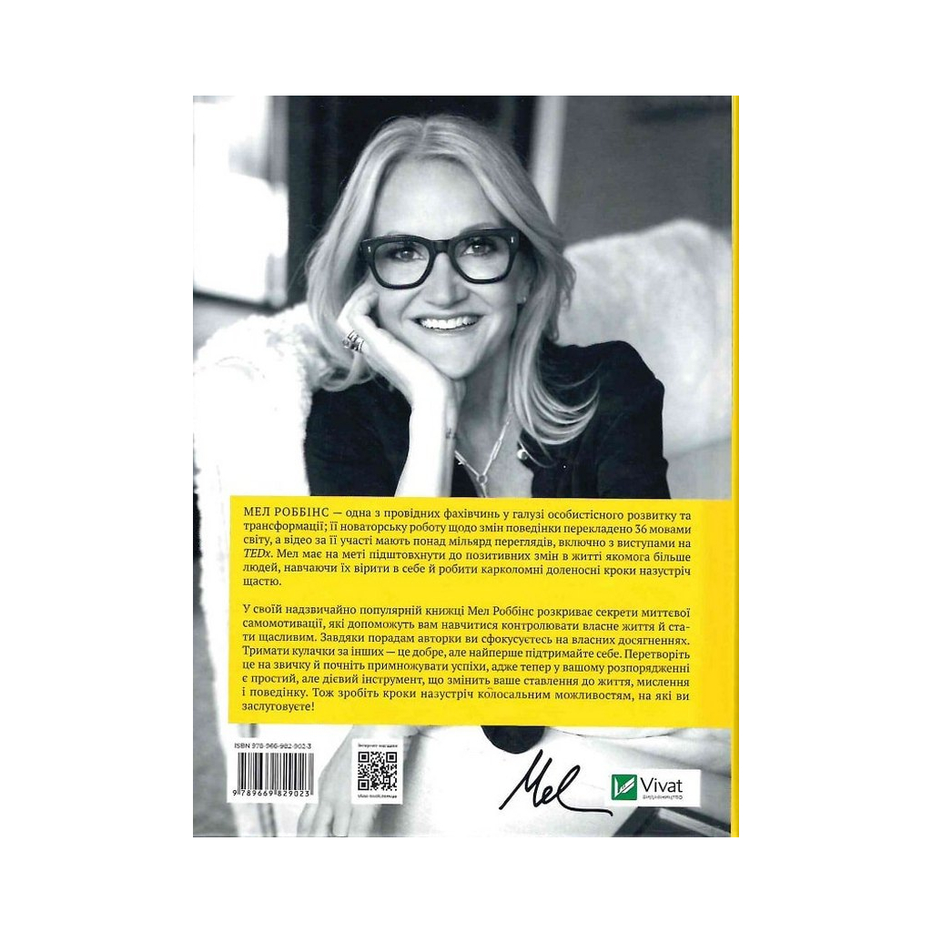 Мел Роббінс — одна з провідних фахівчинь у галузі особистісного розвитку та трансформації; її новаторську роботу щодо змін поведінки перекладено 36 мовами світу, а відео за її участі мають понад мільярд переглядів, включно з виступами на TEDx. Мел має на меті підштовхнути до позитивних змін в житті якомога більше людей, навчаючи їх вірити в себе й робити карколомні доленосні кроки назустріч щастю.
