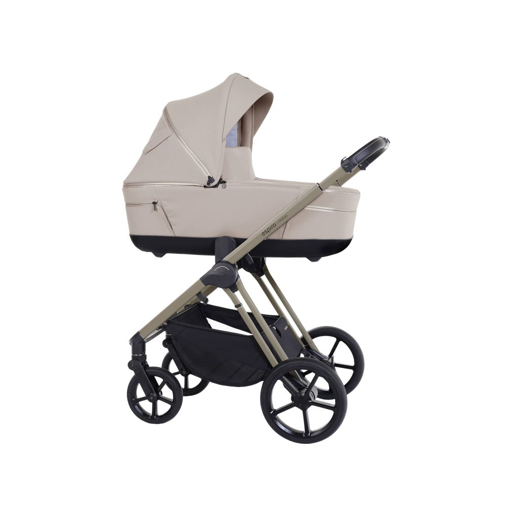 У моделі Espiro Miloo (Еспіро Мілу) передбачена знімна люлька, яка дозволяє використовувати коляску для немовлят від народження. Люлька кріпиться до шасі коляски та оснащена м'якою внутрішньою підкладкою, яка забезпечує комфортне положення для дитини під час сну та відпочинку. Крім того, люлька має капюшон для захисту від сонця та вітру, а також переносну ручку для зручного транспортування. Після того, як дитина виросте з люльки, її можна зняти та використовувати коляску в режимі прогулянки або встановити автокрісло за допомогою відповідного адаптеру для перевезення дитини в автомобілі. Перше, що привертає увагу, це матеріал, з якого вона виконана. Пластик забезпечує люльці невелику вагу та високу міцність. Крім того, використання цього матеріалу забезпечує колясці стильний зовнішній вигляд. Перевагою люльки 2 в 1 Espiro Miloo (Еспіро Мілу) є її плавні форми. Унікальна форма люльки та її дна дозволяє використовувати її як мобільну колиску. Затишок та комфорт під час прогулянок маленькому пасажиру забезпечують утеплена накидка, великий капюшон та м'який матрац. На окрему увагу заслуговує накидка, яку при необхідності можна трансформувати в теплий конверт для найменших. Капюшон у цій моделі регулюється безшумно, оснащений додатковим козирком, який захищає від яскравих сонячних променів. У капюшон вмонтовано ручку, завдяки якій люльку можна переносити з дитиною, яка знаходиться в ній. Є додаткова секція із сітки. На каптурі виробник розмістив оглядове віконце, щоб батьки могли спостерігати за маленькою дитиною. Ручка управління телескопічна, тому гуляти з цією коляскою зручно батькам будь-якого зросту. Оббивка коляски Espiro Miloo (Еспіро Мілу) виготовлена з міцної водонепроникної тканини, що робить коляску неймовірно стильною. На шасі коляски люлька встановлюється одним рухом.