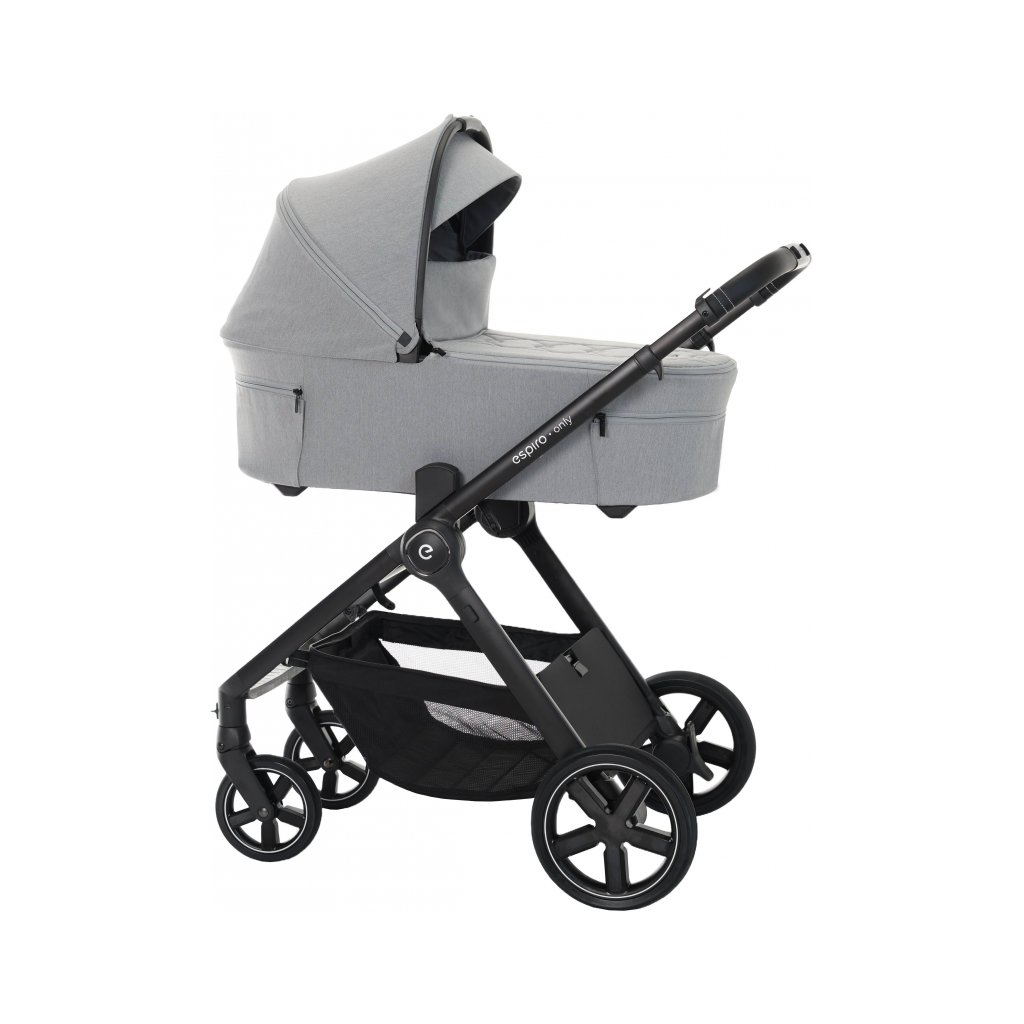 Компактна коляска на матово-чорній рамі з покращеною колискою, яка оснащена сучасною подвійною системою вентиляції. Espiro Only виконана у красивих, модних відтінках тканин, що відповідають сучасним тенденціям.