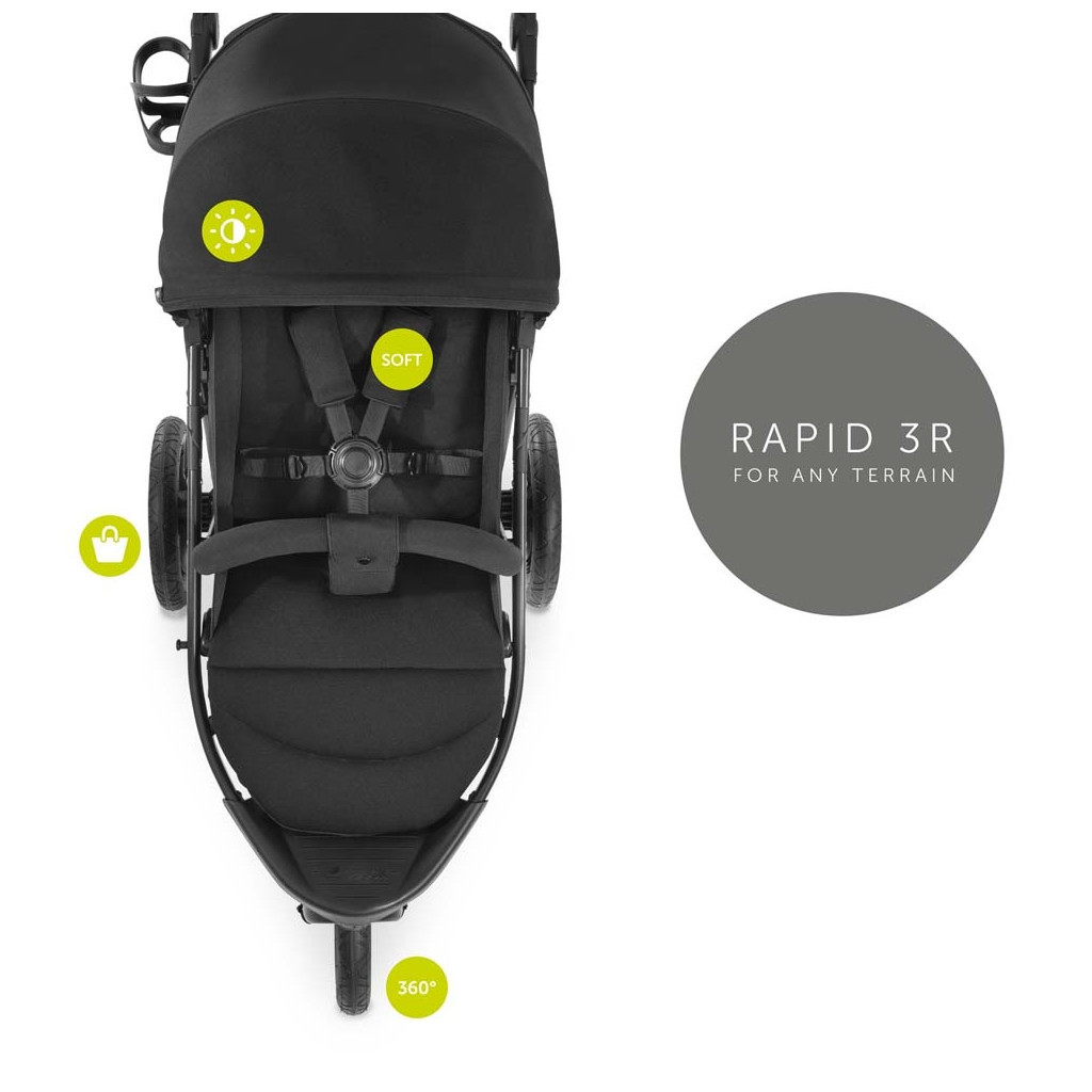 Завдяки ручці, що регулюється по висоті, Rapid 3R можна штовхати в зручній для спини позі. 5-точкові ремені безпеки, бампер із захистом від ковзання та гальмо допоможуть вашій дитині завжди бути в безпеці.