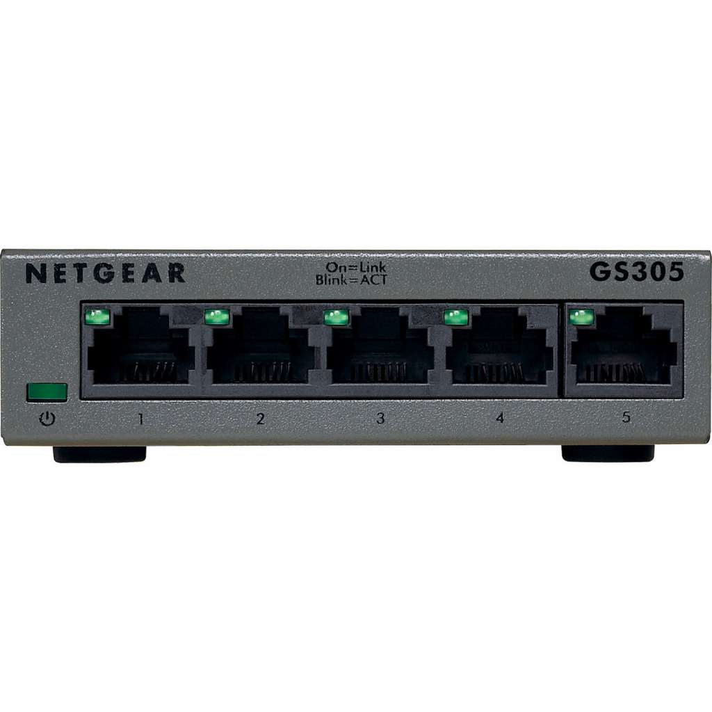 Некерований гігабітний комутатор NETGEARPROSAFE GS305 має 5 портів 10/100/1000 Мбіт/с, на кожному з яких є світлова індикація активності. Пропускна здатність комутатора становить 10 Гбіт/с. Характерними особливостями цього комутатора є: пріоритети трафіку, енергоефективність, автоузгодження для автоматичного з'єднання з кінцевим пристроєм. Автоматичне визначення типу під'єднання MDI/MDIX усуває потребу використання кросоверних кабелів. Неблокувальна комутаційна архітектура забезпечує максимальну швидкість передання даних відповідно до швидкості порту. Пріоритезація трафіку 802.1p і підтримка Jumbo-кадрів забезпечують безшовну інтеграцію зі складнішими мережами.