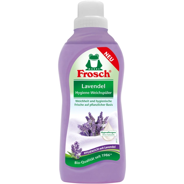 Frosch — серія екологічно чистих і безпечних засобів із рослинними поверхнево-активними речовинамиКондиціонер-ополіскувач Frosch для білизни Лаванда містить активні речовини на рослинній основі. Завдяки добірним ароматам знижується ризик подразнень на шкірі. Робить білизну ніжно-м'якою, зручною для носіння і приємною на дотик.Засіб оптимально пристосований під пральні порошки Frosch.Підходить для кольорової і білої білизни. Придатний для бавовни, віскози, меланжевої тканини, вовни та синтетичних волокон (наприклад, еластану). Не підходить для мікрофібри.