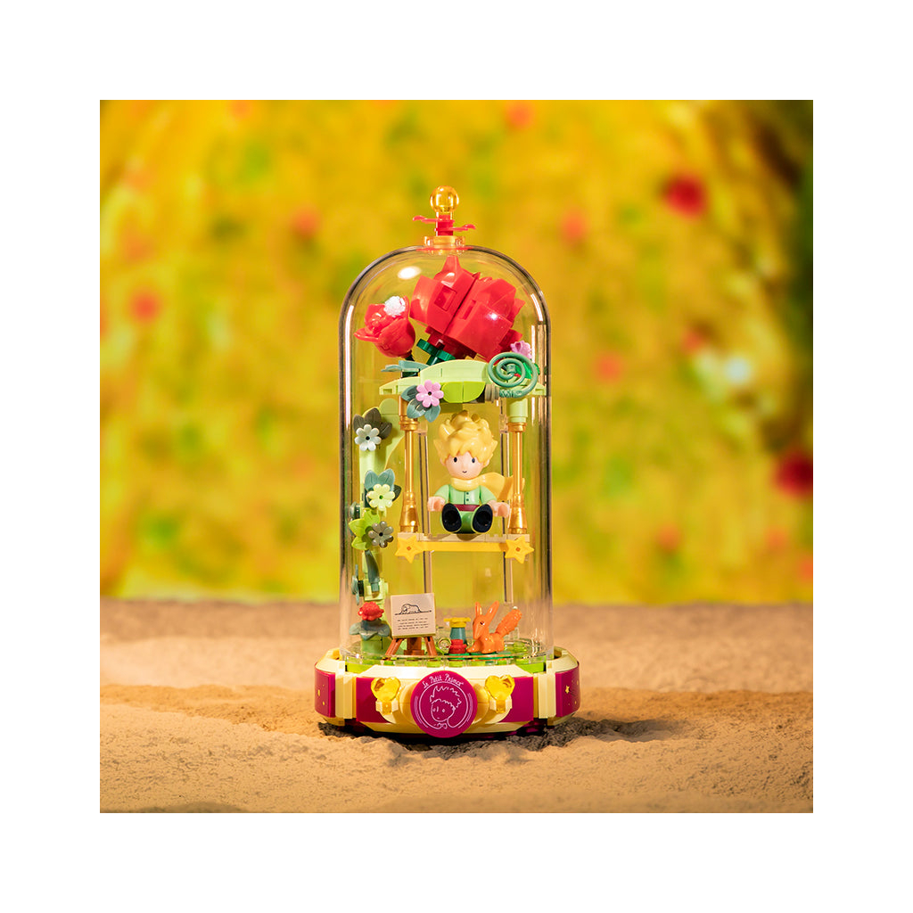 Модель зображує ніжну сцену: маленький принц сидить на гойдалці серед червоних троянд, що ростуть у скляному куполі. Ця композиція символізує чистоту, любов і самотність — основні теми оригінальної історії. Модель виконана в яскравих кольорах і має витончену форму, що нагадує декоративну лампу.