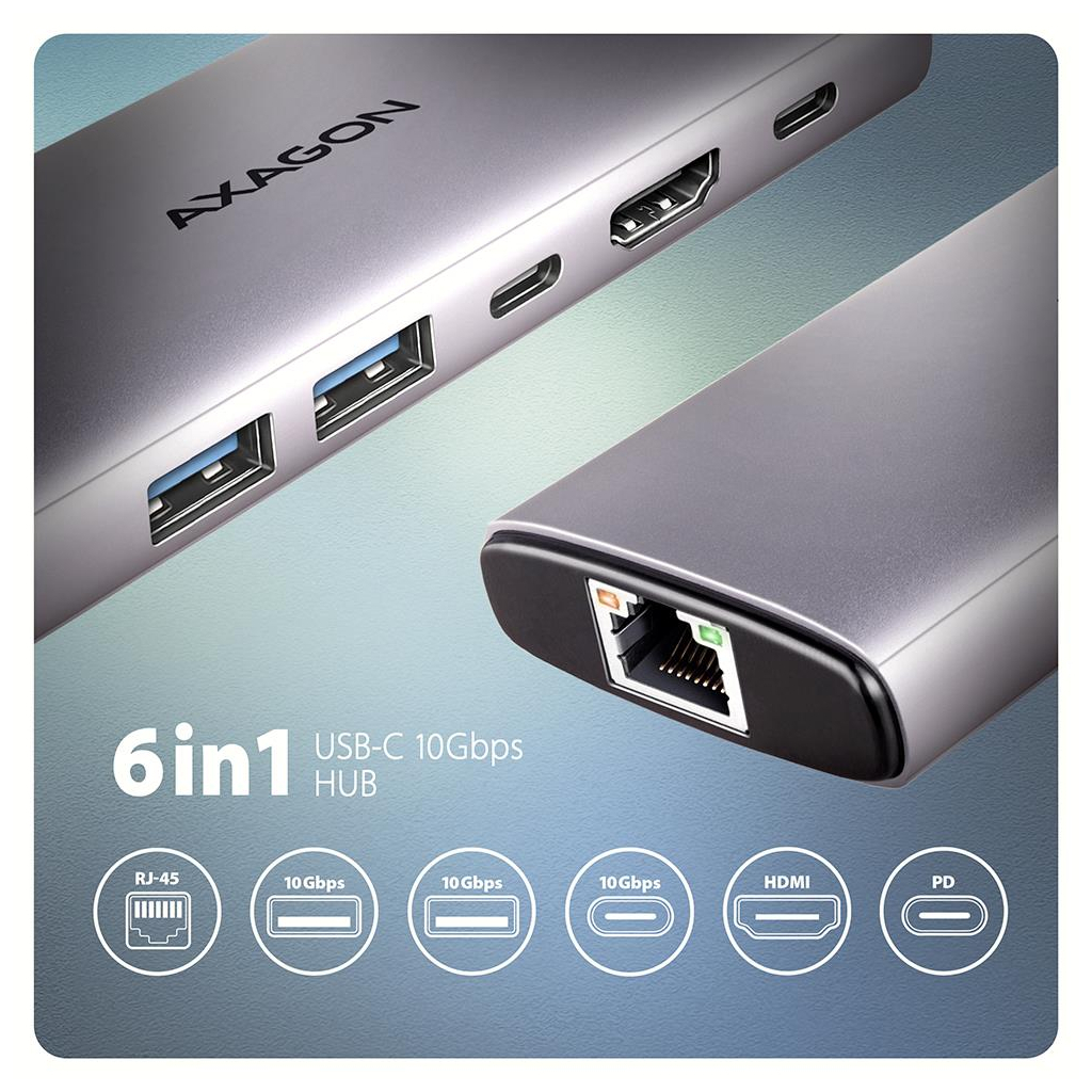 Концентратор AXAGON USB-C to 2xUSB-A + 1xUSB-C + HDMI + RJ45 + PD100W 0.15m gray (HMC-6G2L)
