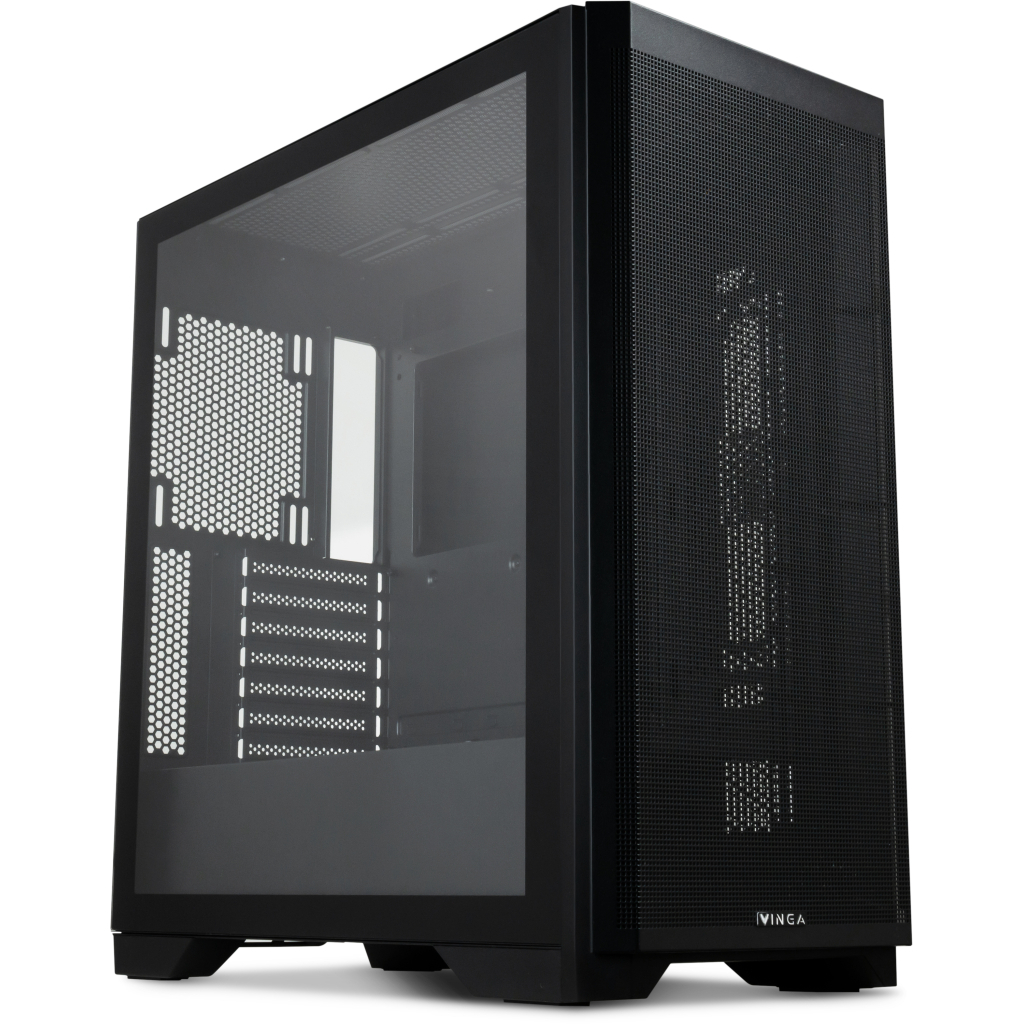 Корпус Vinga Darklight дозволить сконструювати непоганий геймерський комп'ютер: система вентиляції з вентиляційними гратами забезпечує нормальний температурний режим навіть при повному завантаженні. У корпусу є бічній панелі з загартованого скла - вона прозора, тому користувач може побачити, як працює «начинка» корпусу. Місце для блоку живлення знаходиться на дні корпусу, це допомагає погасити вібрацію і зробити рівень шуму нижче навіть при повному навантаженні. На корпусі розташовані кнопки управління живленням і завантаженням системи, а також входи для навушників, USB-порти і входи для мікрофона. Максимально допустимий розмір карт для установки - до 400 мм, максимально прийнятна висота кулера - 175 мм.