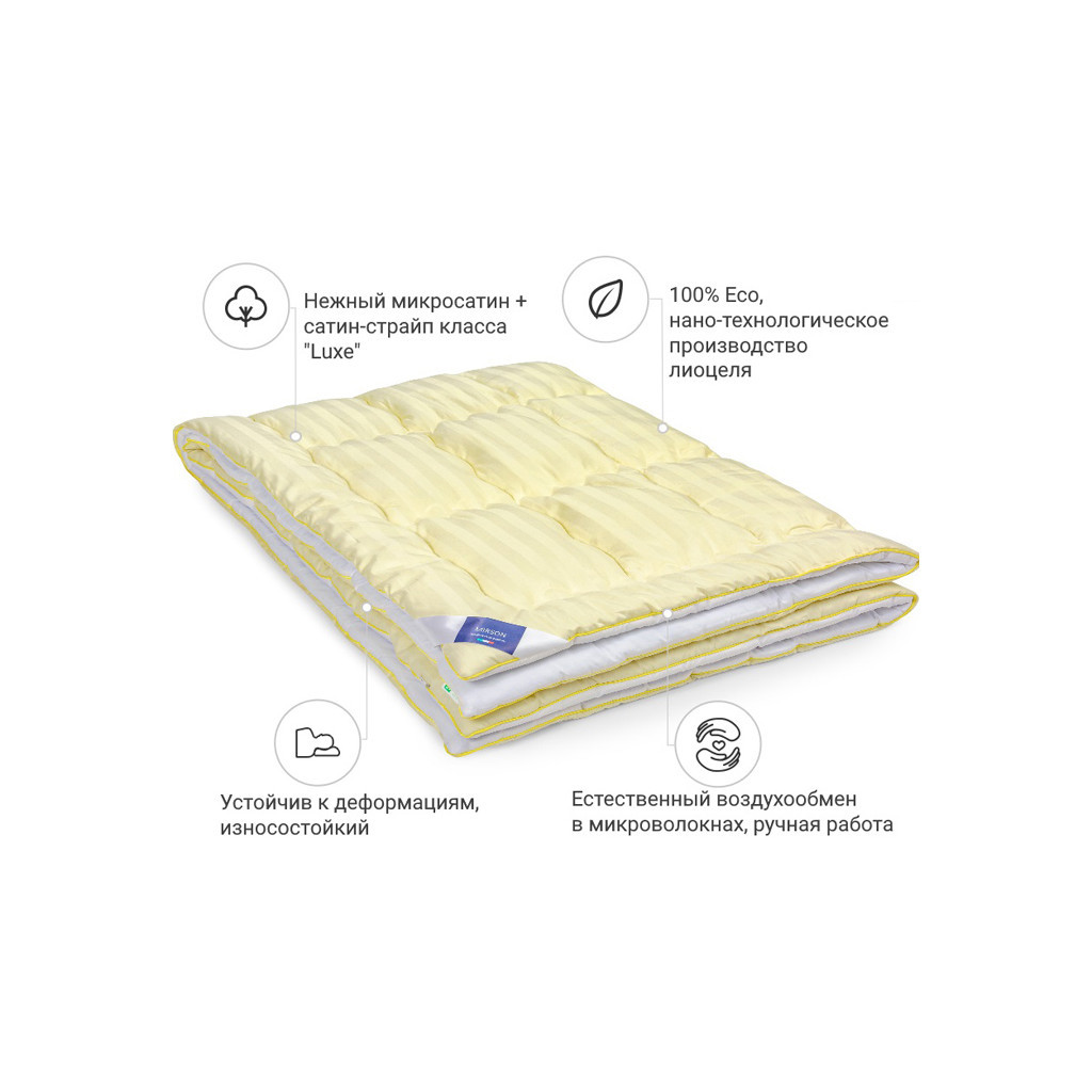 Вишуканий сатин-страйп класу «Luxe», до складу якого входить 5% шовкової нитки й 95% єгипетської високоякісної бавовни, дарує виробам незвичайну ніжність, еластичність і оксамитність, чим і виділяє її серед інших тканин.