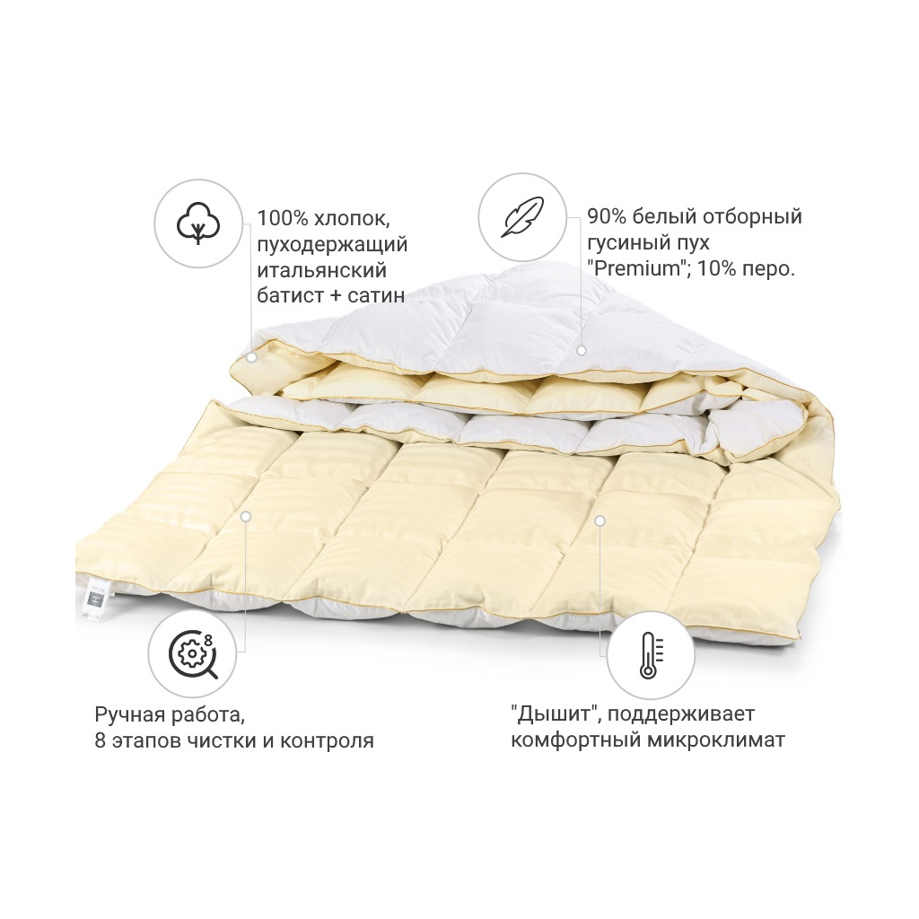 Жоден з наповнювачів не зрівняється за унікальними властивостями натурального пуху. Пух, який використовується при виробництві постільної білизни MirSon, виключно високої якості, що гарантує неперевершений результат: пухнасті, легкі, теплі, абсолютно без запаху і пилу, антиалергенні подушки і ковдри.