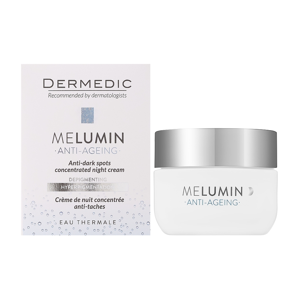 Нічний крем-концентрат Melumin від бренда Dermedic забезпечує шкірі дбайливий догляд під час сну та допомагає позбутися різних проявів пігментації. Він містить ексклюзивний запатентований комплекс Melumin Tristage, який пригнічує активність тирозинази, уповільнює синтез меланіну в меланоцитах і знижує швидкість перенесення меланіну в епідерміс. Це дозволяє запобігти повторній появі пігментних плям.
