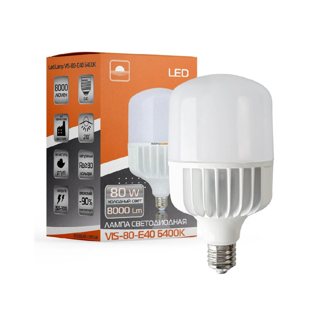 Лампа світлодіодна високопотужна Євросвітло 80Вт 6400К (VIS-80-E40) підходить для місць, де важливо яскраве освітлення, що не спотворює колір.