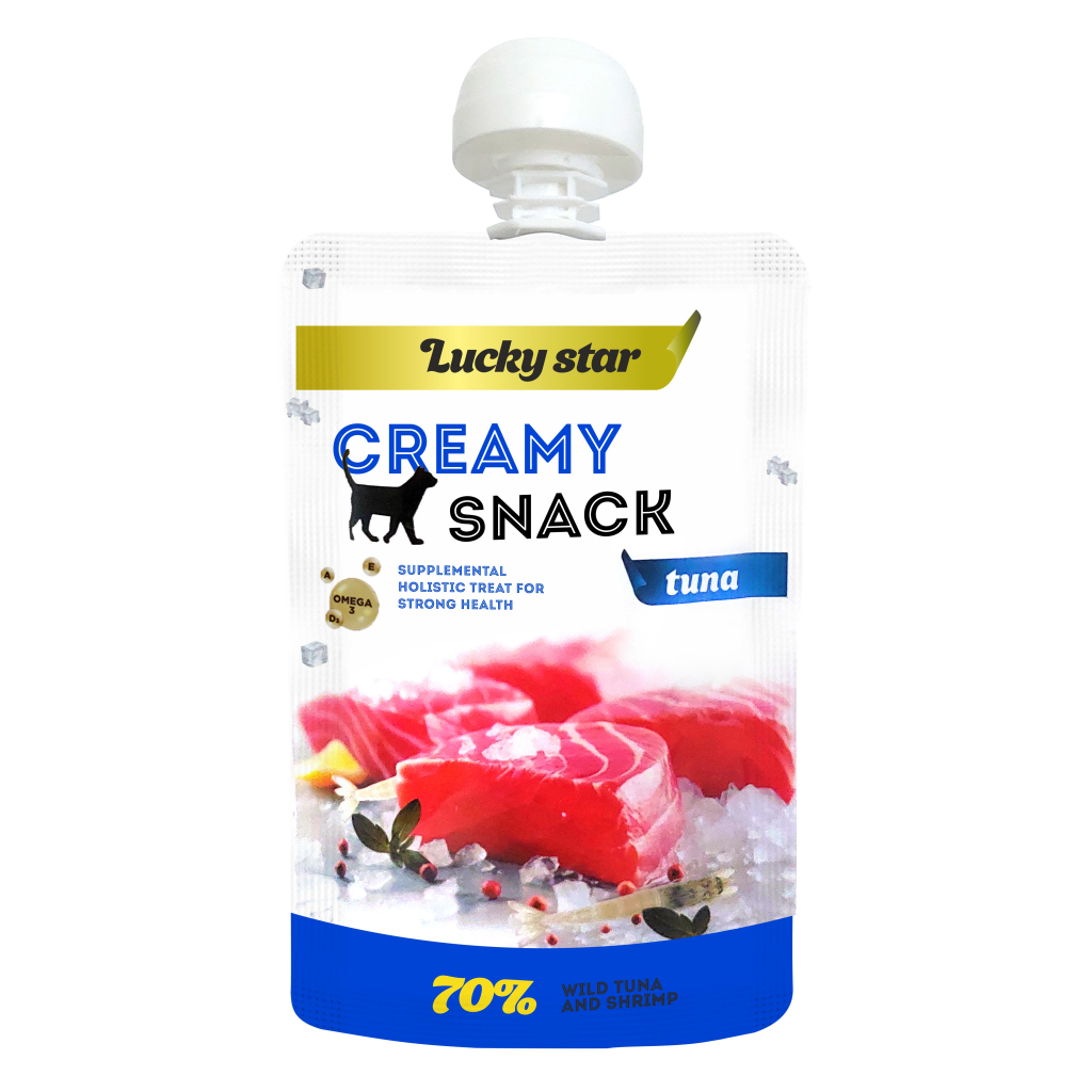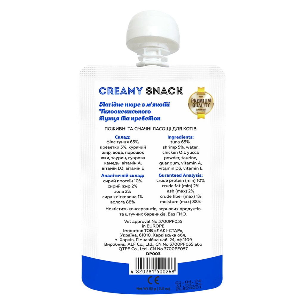 Ласощі для котів Lucky Star Лагідне пюре з м'якоті тихоокеанського тунця та креветок 85 г (4820281500268)