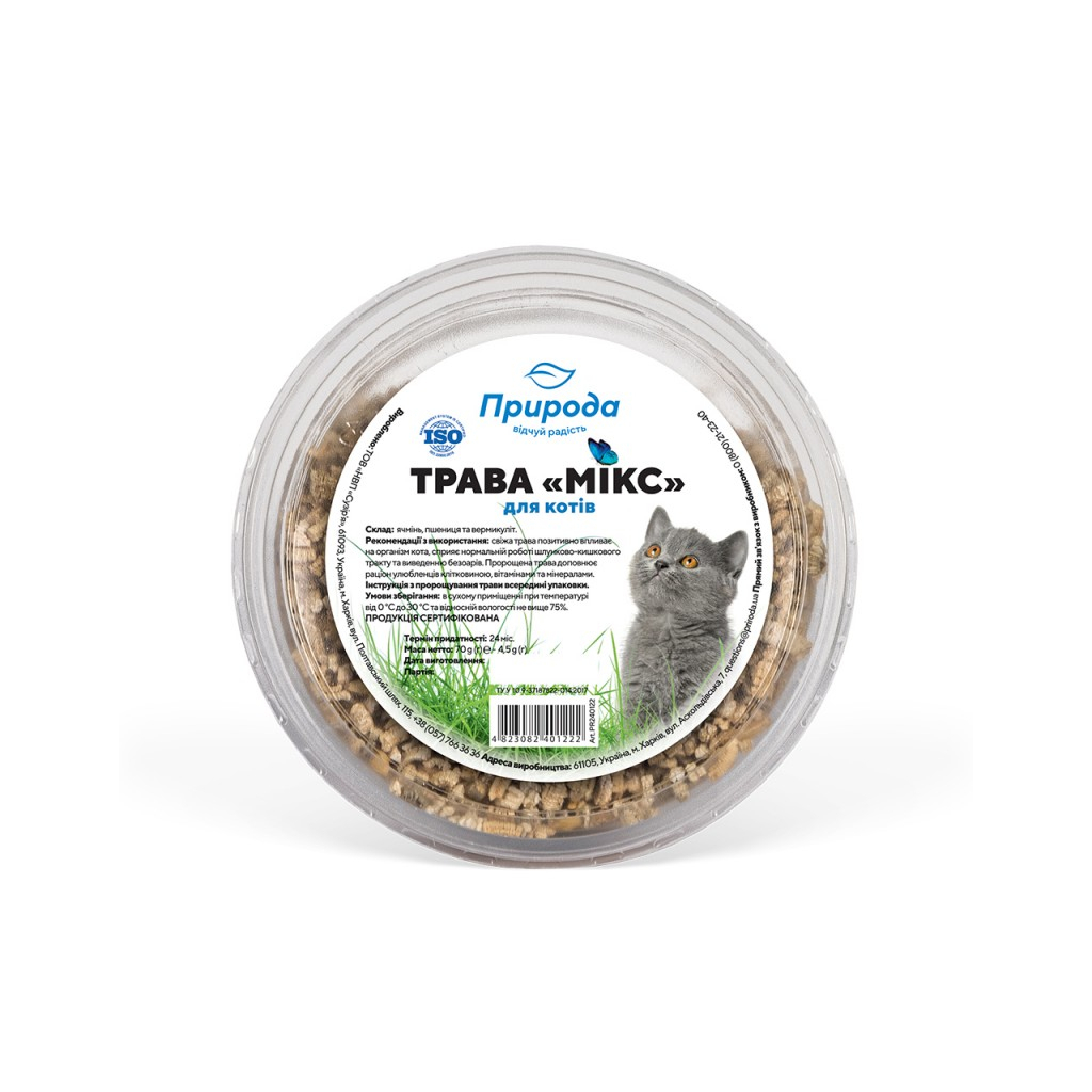 Трава для котів «Природа» - це суміш добірних зерен вівса та пшениці, що не піддавалися додатковій обробці. Паростки різних культур містять багато різноманітних мікроелементів і цікавість та неабиякий викликають апетит в улюбленців.