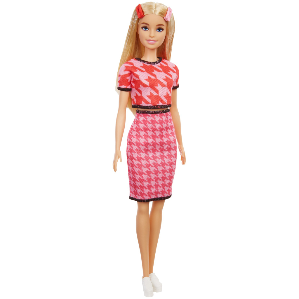 У комплекті лялька Barbie, яка одягнена в костюм (верх-низ) з кофтою з короткими рукавами та спідницю до коліна з принтом у ламану карту й білі кросівки з відкритою п'ятою. Дві шпильки прикрашають зачіску ляльки та роблять її образ милішим.