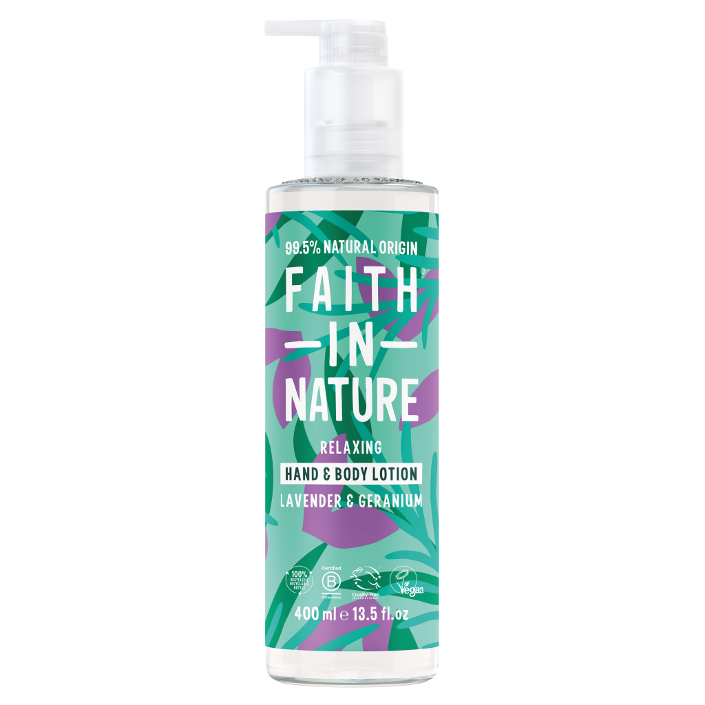 Лосьйон для рук і тіла з лавандою і геранню з лінійки натуральних лосьйонів для тіла Faith In Nature, всі з яких багаті вітамінами, антиоксидантами та мінералами, схвалені The Vegan Society, не тестуються на тваринах і виготовлені з інгредієнтів найвищої якості природного походження.