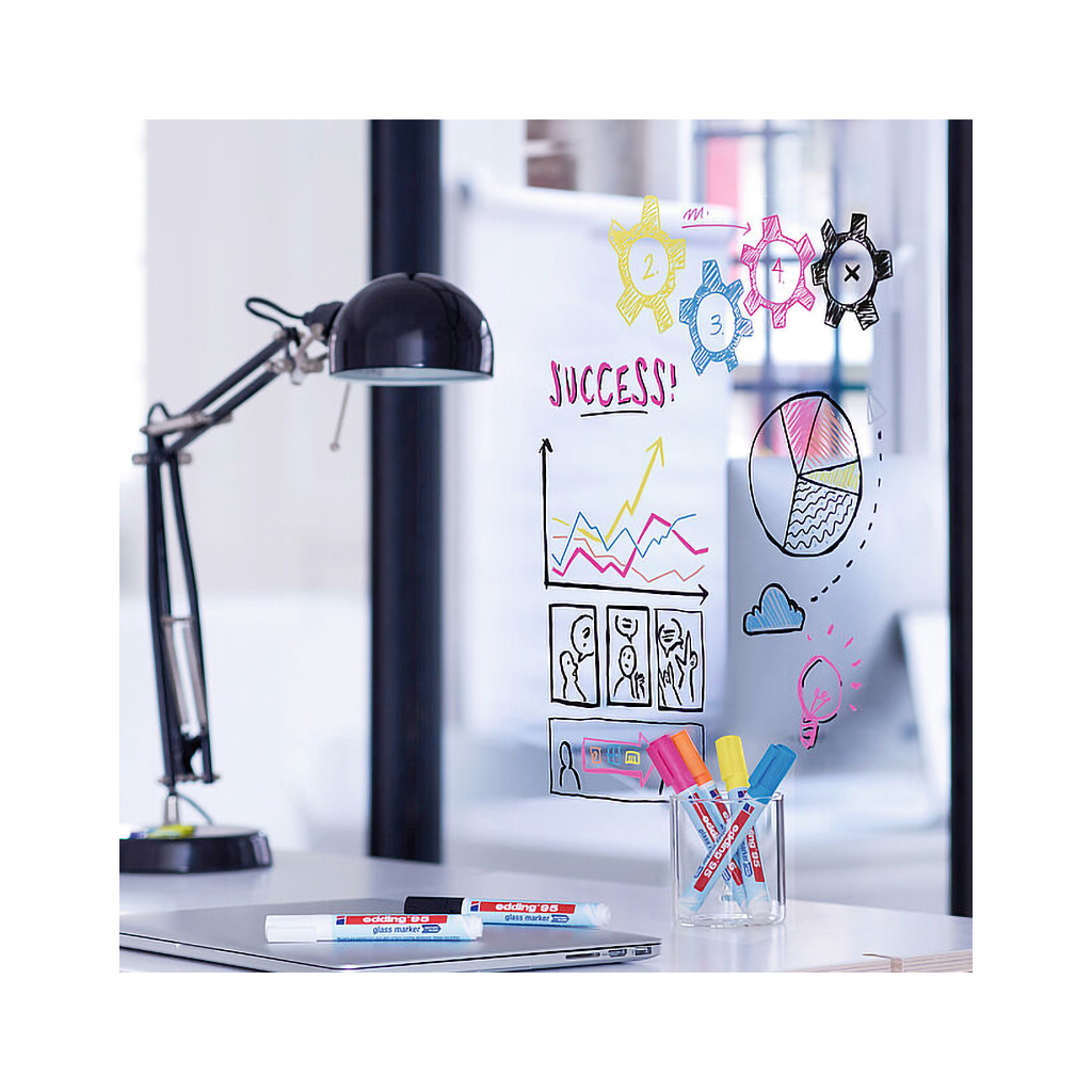 Маркер edding Glass e-95/06 підходить для нанесення написів і маркування на скляні поверхні, а також скляні та білі дошки. Стане чудовим інструментом для створення блискучих написів, малюнків і діаграм. Флуоресцентне чорнило практично без запаху, світлостійке та має непрозорий колір. Напис легко витирається сухою тканиною, не залишаючи слідів на поверхні. Округлий пишучий вузол. Ширина лінії: 1,5-3 мм.