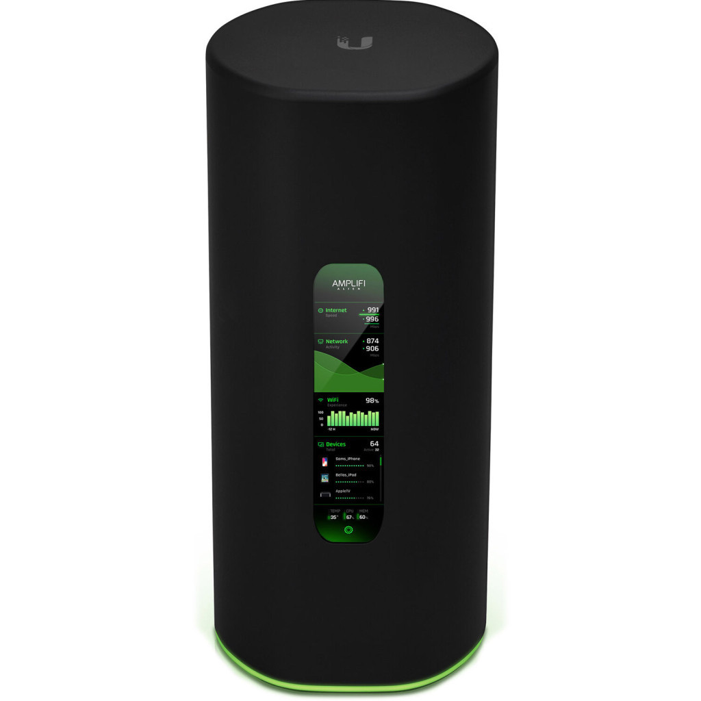 AmpliFi Alien Router володіючи витонченою конструкцією, тридіапазонний маршрутизатор доставить домашньому користувачеві всі переваги революційної технології Wi-Fi 6. Продуктивність мережі зросте в чотири рази, а зона покриття - у два, і при цьому зменшиться розряд акумуляторних батарей мобільних пристроїв. AmpliFi Alien Router оснащений радіостанціями діапазонів 2,4/5 ГГц стандарту Wi-Fi 6 та діапазону 5 ГГц стандарту Wi-Fi 5. Це забезпечить сумарну пропускну здатність 7685 Мбіт/с та 16 просторових каналів з єдиного пристрою AmpliFi Alien. Побудувати Wi-Fi мережу в будинку, з практично безмежною пропускною здатністю, можна легко, з'єднавши кілька пристроїв ефіру. Wi-Fi роутер використовується як для роботи як автономного маршрутизатора, так і як MeshPoints для підключення необмеженої кількості маршрутизаторів AmpliFi Alien і розширення зони покриття. Поєднайте в мережу кілька пристроїв і насолоджуйтесь практично необмеженою пропускною здатністю Wi-Fi вдома або в офісі. Яскравий сенсорний дисплей відображає стан мережі та забезпечує миттєве керування. Для вашої зручності налаштуйте дисплей, і зелене світлодіодне кільце автоматично вимкнеться.