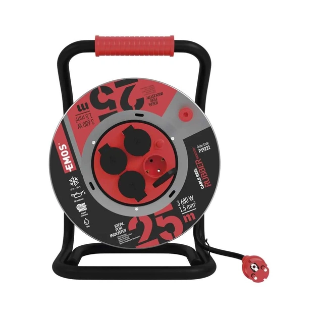 Подовжувач дозволяє підключати до чотирьох електричних пристроїв, а завдяки діаметру провідника 2.5 мм² кабель гума / неопрен витримує перевантаження до 3680 Вт (16 А) при повному розмотуванні. Великою перевагою є довжина 25 м, що дозволяє гнучко працювати без обмежень.
